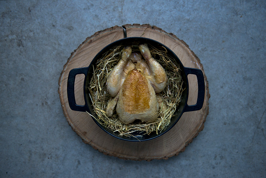 Dit heerlijke kippetje wordt in ’t hooi gebraden, en wel in een prachtige Dutch oven van Combekk. Dit Nederlandse merk maakt geëmailleerde gietijzeren pannen van volledig gerecycled materiaal, bijvoorbeeld treinrails. Bijzonder, maar ook heel erg praktisch, want je kunt er perfect in bakken en braden.