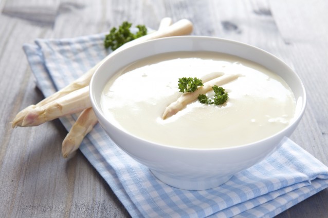 Voeg vlak voordat je de soep serveert de aspergepuntjes toe en laat hooguit vijf minuutjes opwarmen. Eet smakelijk!