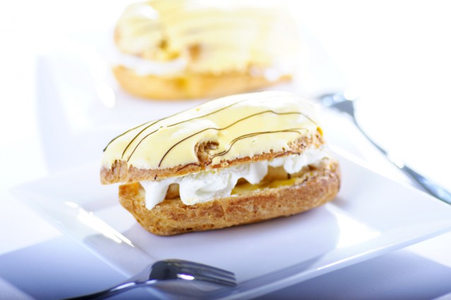 Halveer de soezen. Dip de bovenkantjes (de bolle kant) in het glazuur en maak met behulp van een vork dunne sliertjes chocolade over het glazuur. Spuit met een spuitzak een laagje banketbakkersroom op de onderkantĀ enĀ topĀ met de slagroom. SluitĀ af met het bovenkantje.