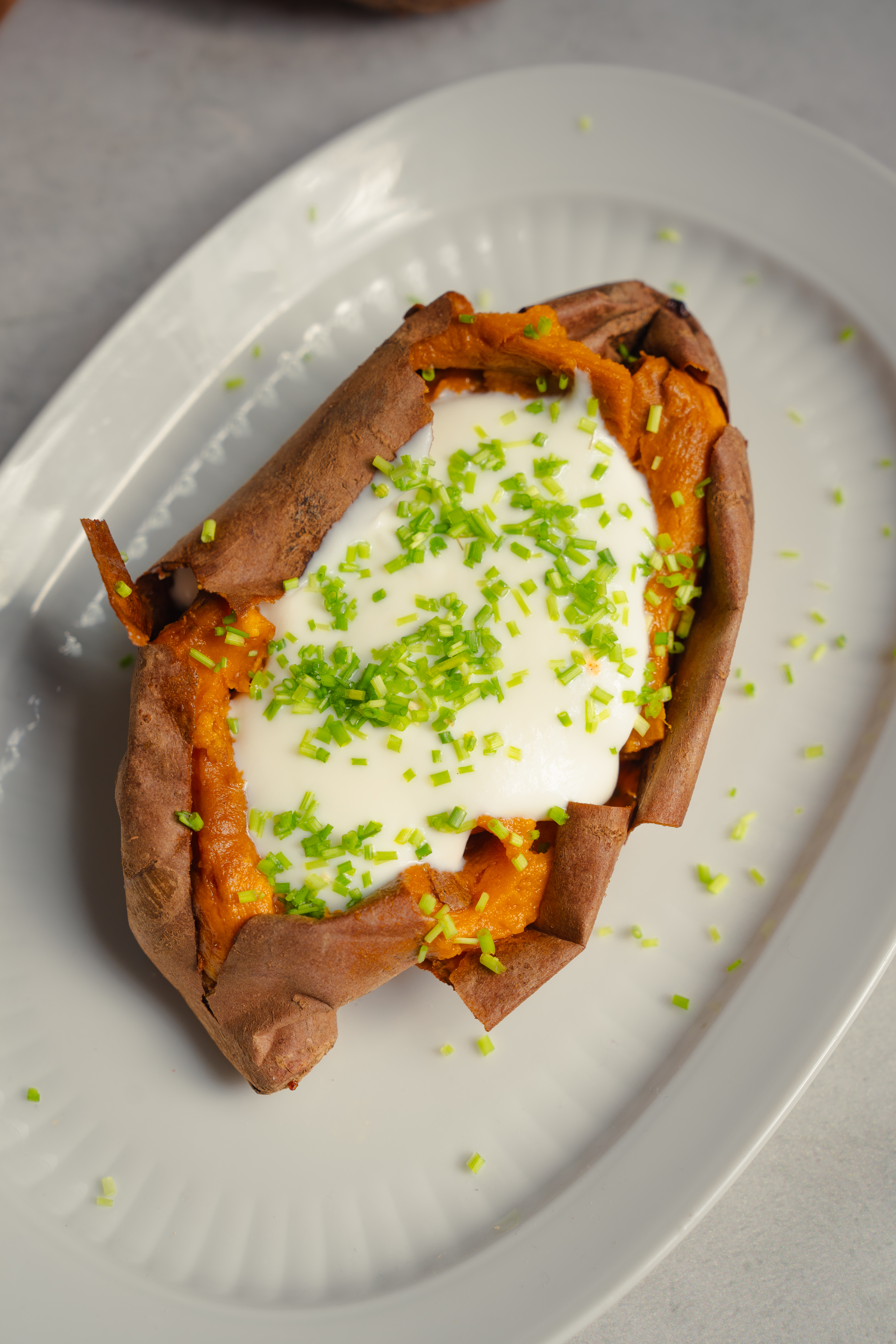 Wat deze manier van bereiden zo fijn maakt, is dat de zoete aardappel door het poffen zijn natuurlijke suikers naar boven haalt. De binnenkant wordt boterzacht, bijna als een puree, terwijl de schil een beetje krokant wordt.