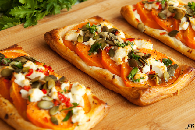 Haal het deeg uit de koelkast en bestrijk het dun met losgeklopt ei. Verdeel de zure room op de deeglappen en laat een vijf millimeter brede rand rondom vrij. Schik de plakken zoete aardappel licht overlappend op de roomlaag en laat de rand vrij. Bestrooi met zout en peper, verkruimel de kaas erover en bestrooi met pompoenpitten en de fijngehakte chilipeper.
