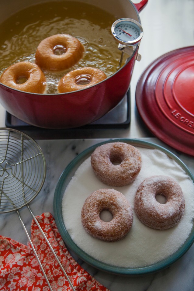 Meng voor de klassieke donuts de fijne suiker eventueel met de kaneel en wentel de warme donuts door deze (kaneel)suiker.