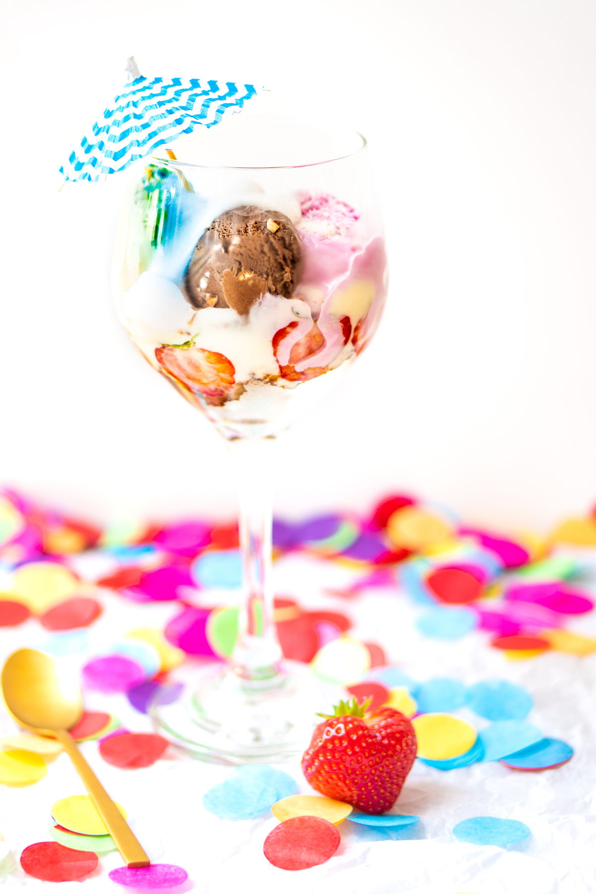 Giet er een laagje vla overheen en verdeel daarna de drie bollen ijs over de vla. Maak af met een laagje vruchtenyoghurt én een ijs parasolletje.