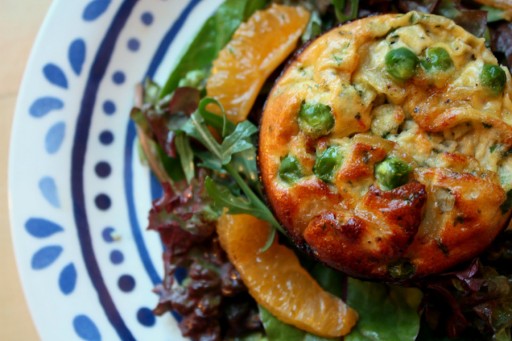 Vet de muffinvorm in met olie en verdeel het doperwten-ui-mengsel over ongeveer 4 of 5 vormpjes. Giet het omeletmengsel erin tot net iets onder de rand. Bak vervolgens ongeveer 15 minuten in de oven tot het eimengsel gestold is.