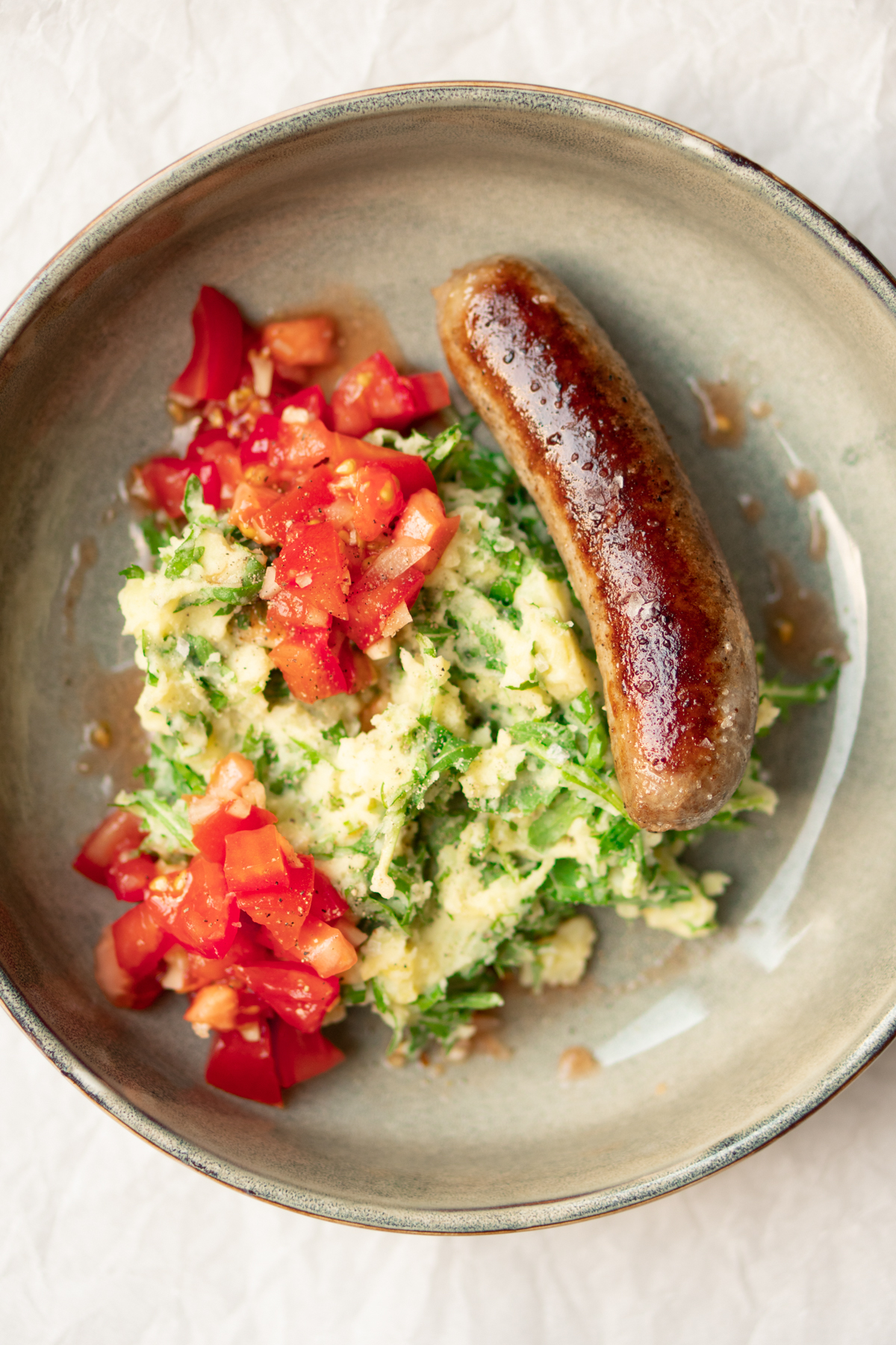 Zomerse rucolastamppot met (blended) worst van Jean Beddington