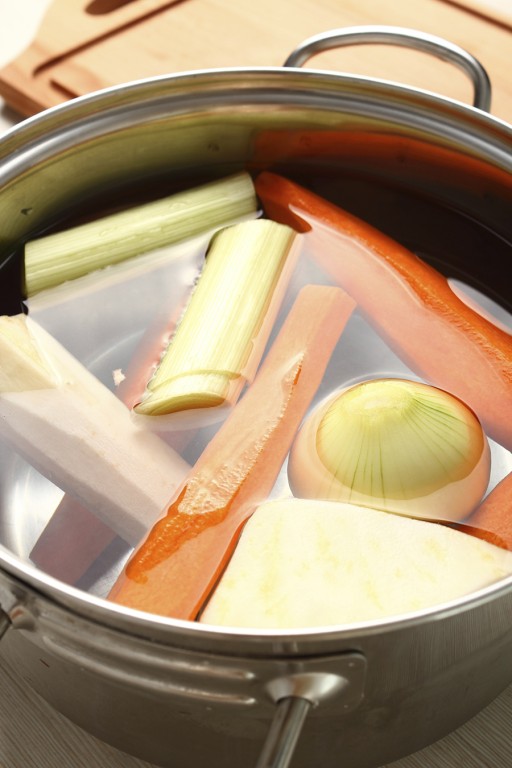 Doe het water in een grote soeppan en voeg het soepvlees, de grove stukken groenten en het zout erbij. Breng langzaam aan de kook en zet vervolgens op de allerlaagste stand. Laat zo minstens 3 tot 6 uur op een heel zacht vuurtje trekken.