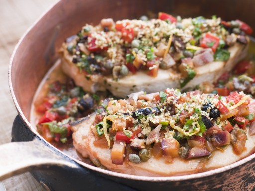 De Involtini di pesce spada alla Siciliana gelden in Italië als een secondo, oftewel een hoofdgerecht. Serveer drie stuks per persoon met een bijgerecht van groenten, bijvoorbeeld aubergines, of zoals ik ze kreeg, met gebakken scampi.