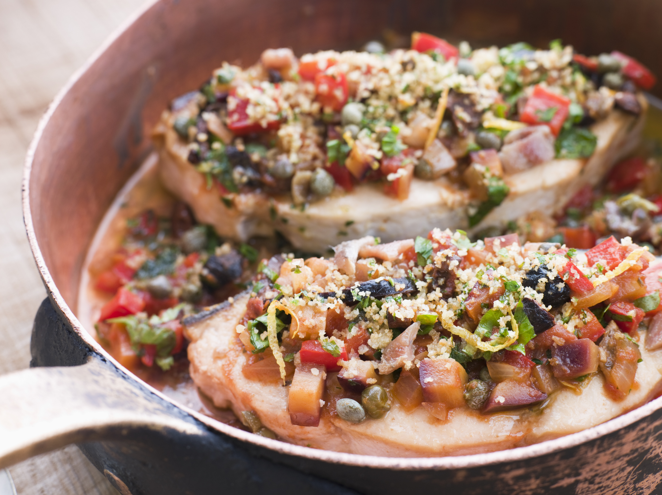 De snijresten worden kleingesneden voor de vulling. In een pan met wat hete olijfolie, op een laag vuur, de ui, bleekselderij en het knoflookteentje fruiten, daarna de peterselie en de kleingesneden zwaardvis erbij. Vervolgens een paar eetlepels broodkruim of paneermeel erbij en goed omscheppen.