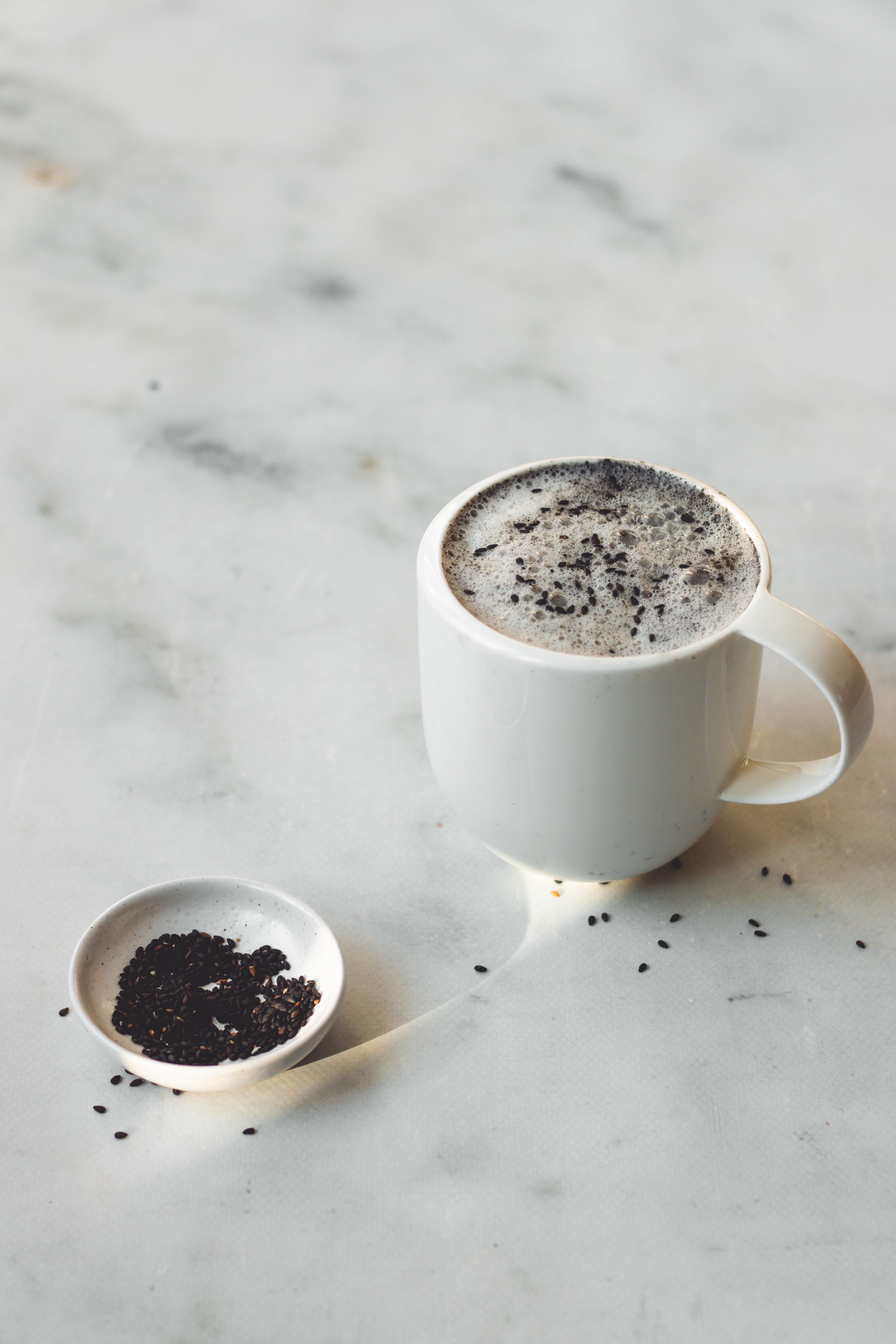 - Giet het mengsel van de zwarte sesam latte in een kop en voeg de geschuimde melk daaraan toe. Maak af met zwarte sesamzaadjes.