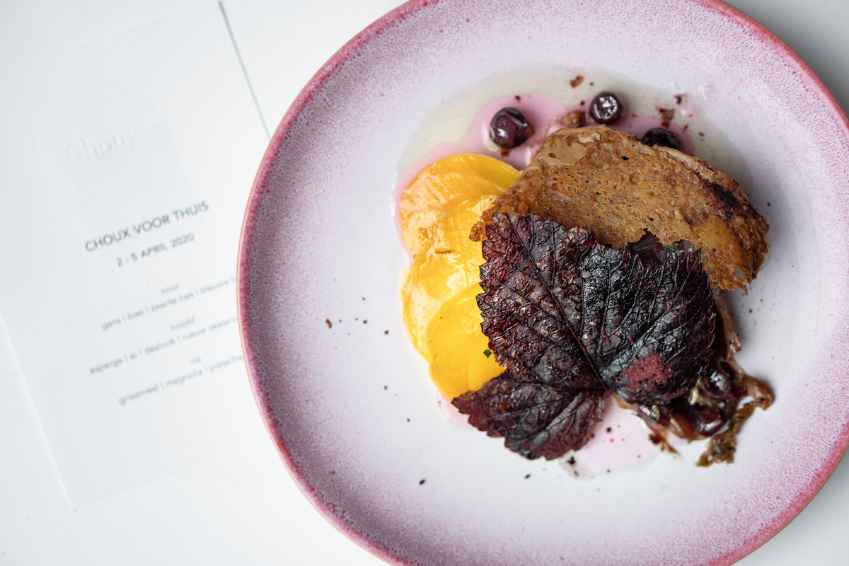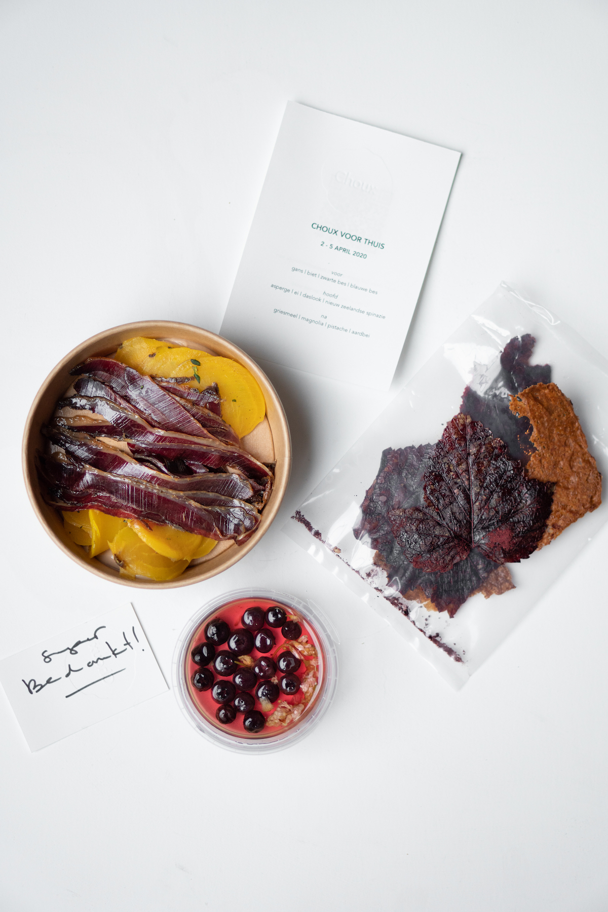 Als we de ingrediënten van het afhaalmenu van Choux thuis openmaken, vallen we van de ene verbazing in de andere. Het lijkt wel kunst. We staren haast verliefd naar prachtig gedroogd zwartebessenblad en blauwe besjes in een neonroze marinade van cassisbloesem en zwartebessentakkenolie. Snap je nou wat we bedoelen?