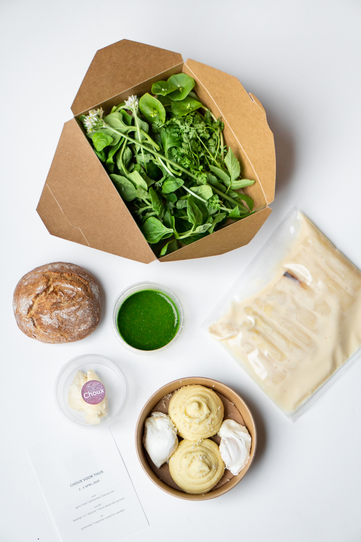 Bij Choux noemen ze hun afhaalmenu een ‘doe-het-zelf-driegangenmenu’. Je moet namelijk thuis nog wat dingetjes opwarmen voordat je aan tafel kunt. Maar maak je geen zorgen: je hoeft geen stukken vlees te garen tot de ideale cuisson of ingewikkelde sauzen te bereiden: feitelijk komt het neer op wat dingen opwarmen in pannetjes.