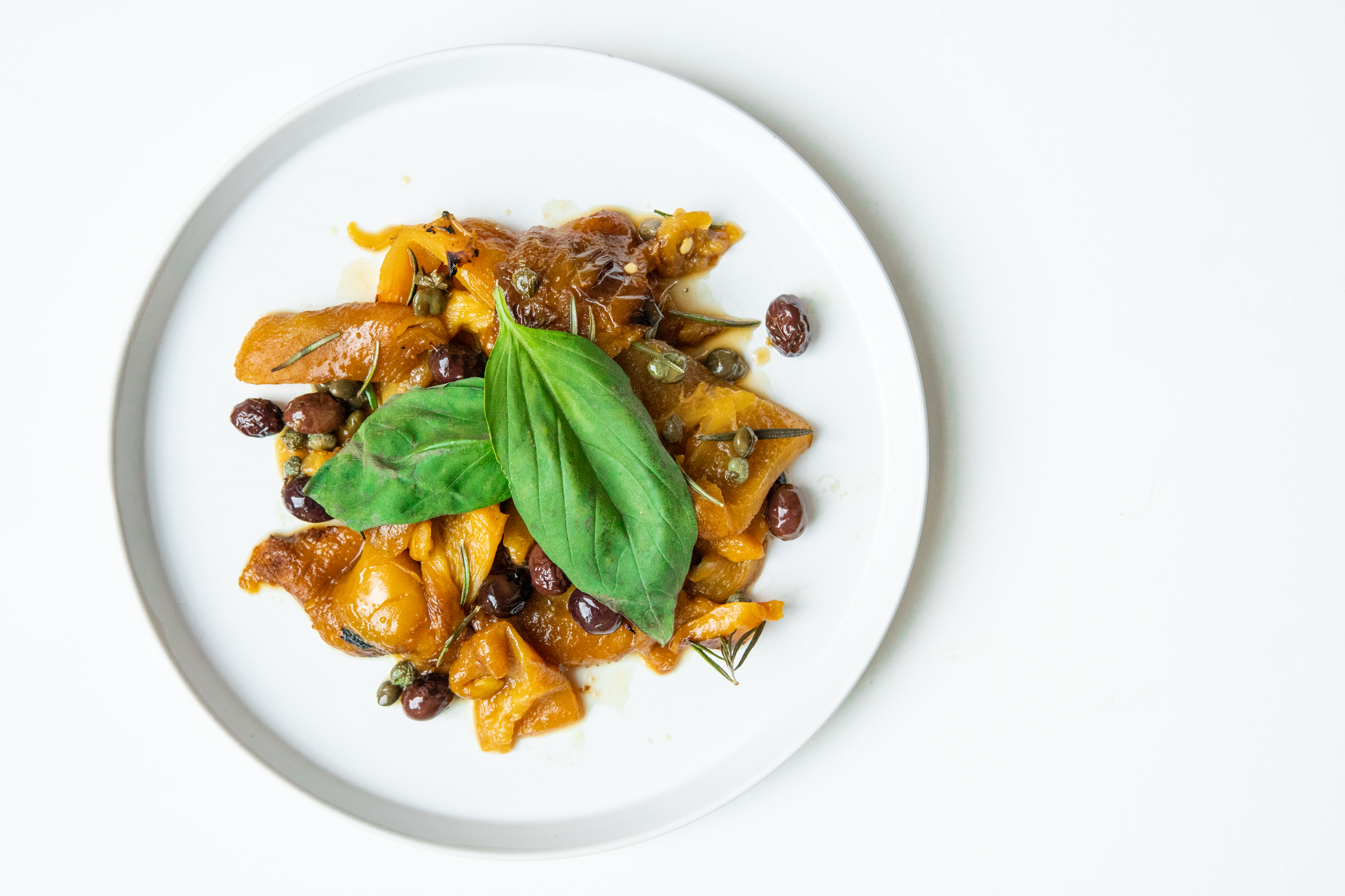 Daarvoor moeten we de inhoud van een bakje even verwarmen in de oven. Paar takjes rozemarijn erop en huppetee. Daarna eten we een heerlijk bordje gele paprika met Madame Jeanette, olijven en kappertjes.