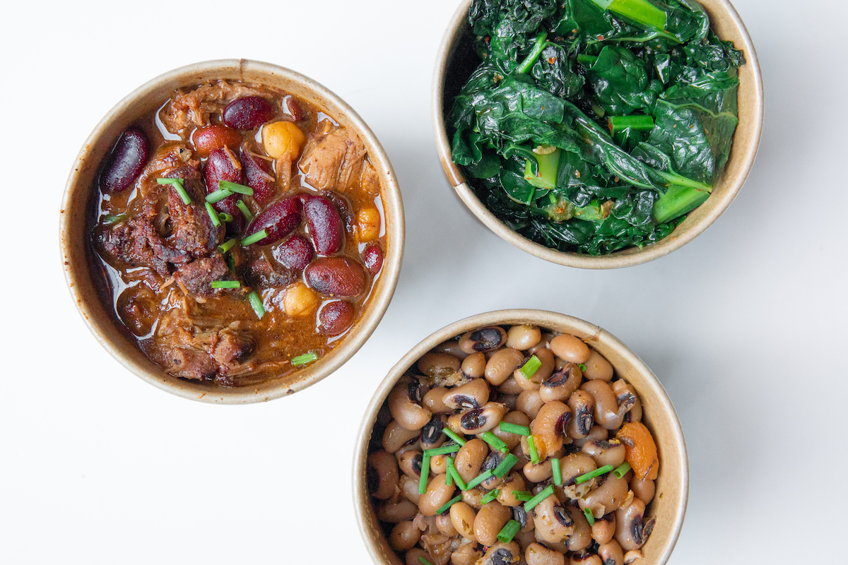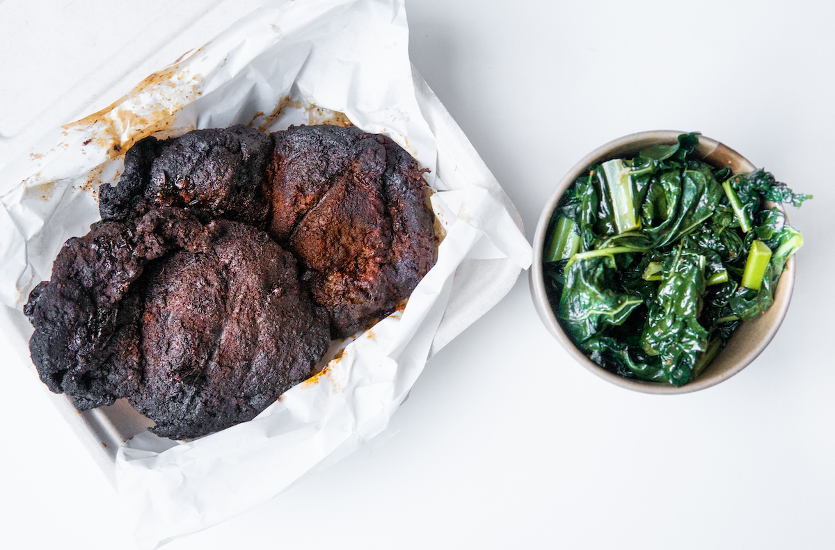 De greens (ofwel bladgroenten) die in Amerika zo onmisbaar zijn bij een good old Texas-style barbecue bestaan uit grote bladeren boerenkool met geroosterde knoflook en chili. De groenten zijn nog lekker knapperig. En de black eyed peas zijn een southern classic die je onmisbaar zijn bij een echte Kansas City-style barbecue. Van deze portie hebben we trouwens wel dríé dagen kunnen eten…