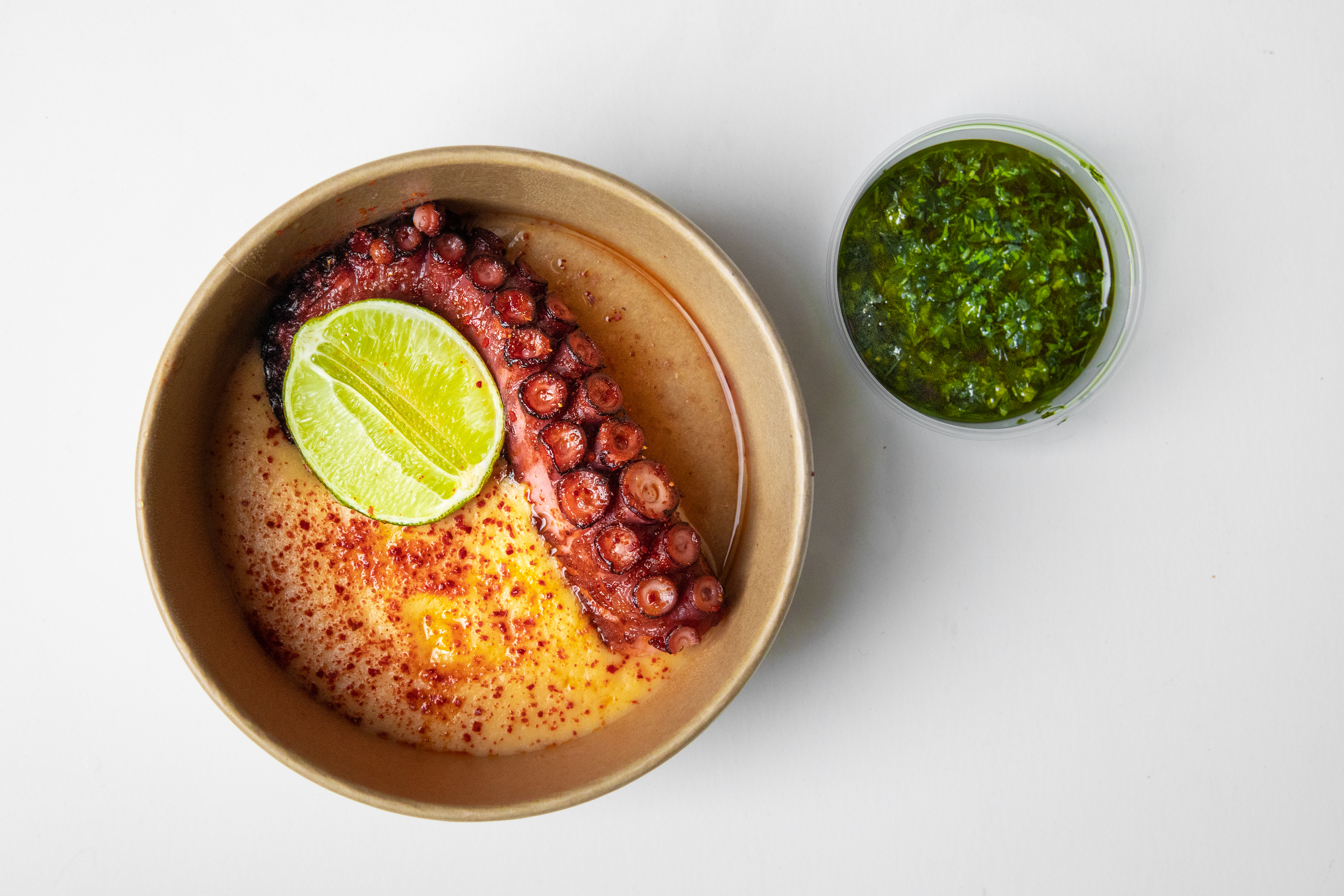 Ook de pulpo (met een frisse salsa verde on the side) is heerlijk mals. Toen we ‘m in het restaurant aten, had ‘ie ook nog een onweerstaanbare knapperige korst. Die is nu – misschien door de condens van het afhaalbakje – wat minder aanwezig. Maar als je ’t niet had geweten, had je ‘m ook niet gemist. En bovendien: de jalapeño-aardappelmousseline die nu bij dit gerecht wordt geserveerd, is goddelijk.