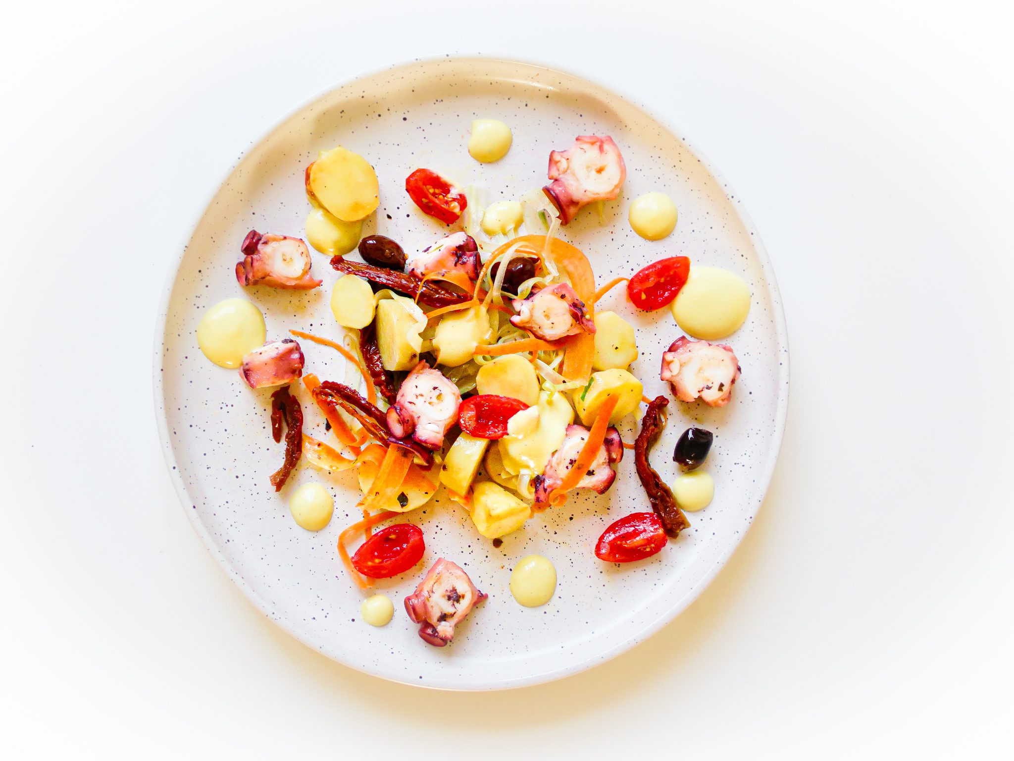 Qua smaak bewijst dit gerecht dan weer dat mooie ingrediënten niet vragen om een ingewikkelde bereiding. De perfecte bite van de pulpo, de doordringend zoute smaak van de olijven en de homemade aïoli smaken ontzettend goed. De salade vanuit het bakje op een bord schikken en er een beetje aïoli bij lepelen: zo makkelijk kan een steengoed voorgerecht zijn.