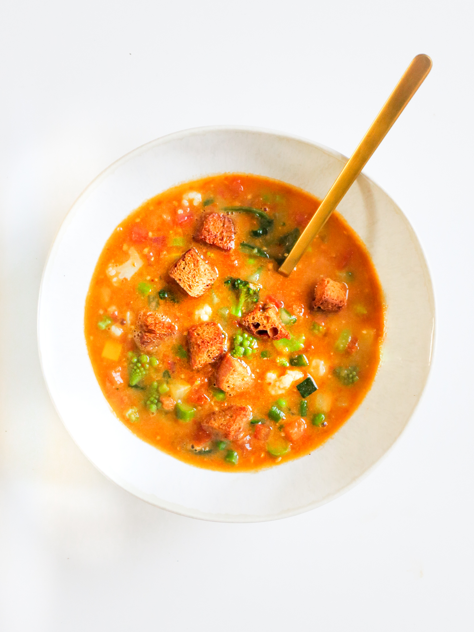 Met de croutons erbij is het misschien wel de lekkerste minestrone die we ooit gegeten hebben. Zo met kleine stukjes knapperige romanesco hadden we die in ieder geval nog nooit gehad, maar na even onderzoek te doen blijkt dat dit in Italië wel vaker wordt gedaan. En proeven we nu anijs? In ieder geval: su-perlekker.