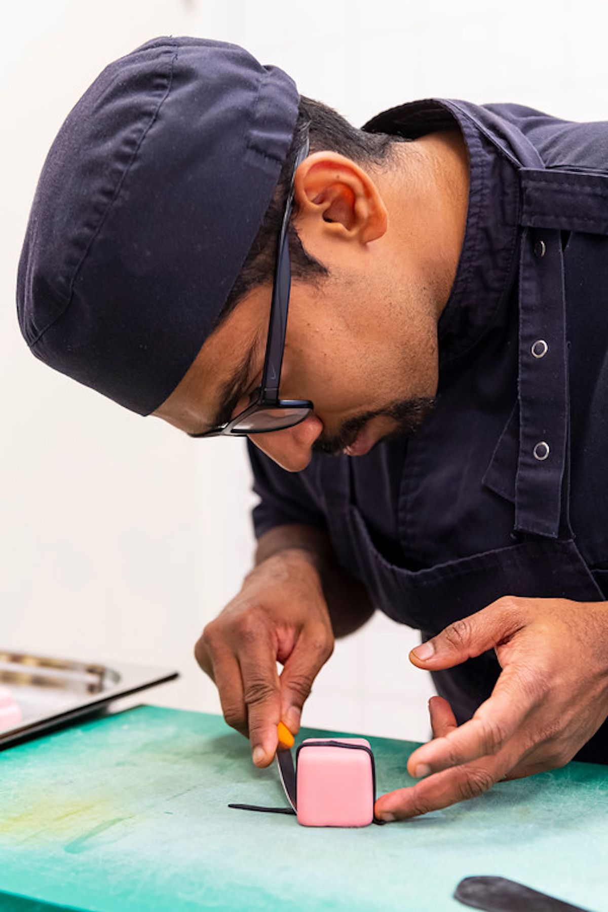 Wij vinden het geniaal hoe chef Vipin Charly elke keer weer met die gekke thema’s en creaties op de proppen komt. De chef groeide op in India en volgde daar een patisserie-opleiding. Zijn eerste grote baan was bij het Ritz Carlton in Doha (de hoofdstad van Qatar), waar hij een team van 25 mensen aanstuurde. Hij leerde er ook zijn vrouw kennen, die afkomstig was uit Amsterdam. Het bracht hem naar onze hoofdstad.
