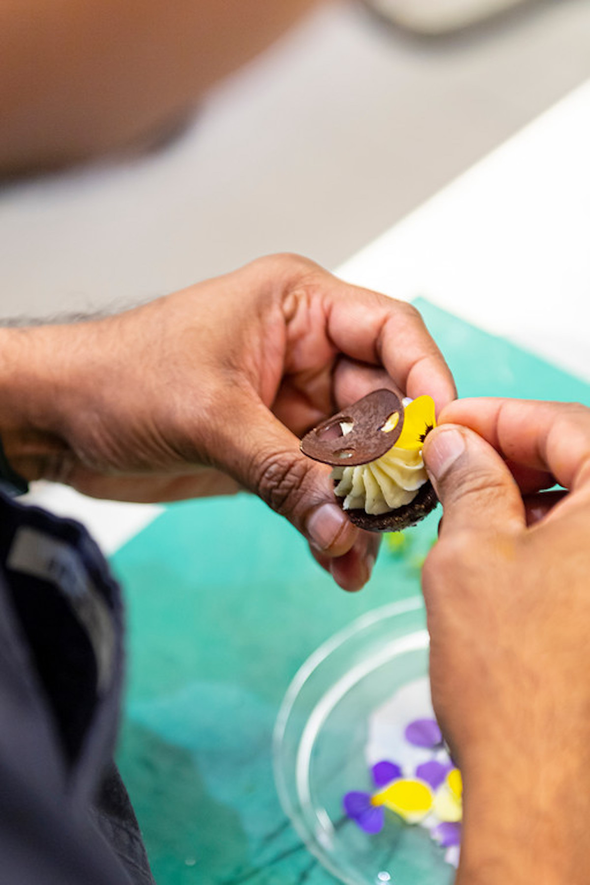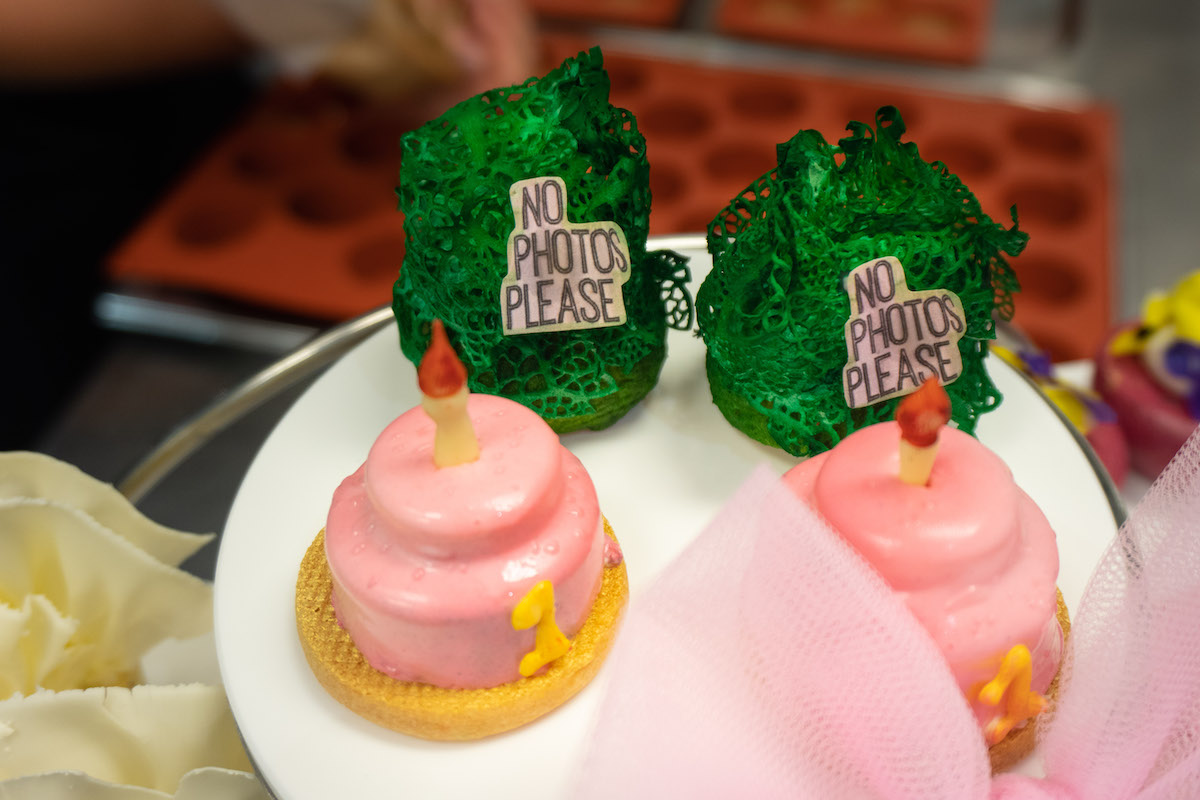 Het lastigste voor de chefs was om de Flowerbomb parfumdoos goed te krijgen. Dat lag vooral aan de grootte: zo’n vierkant hapje wordt algauw te groot, maar dat maakt het weer lastiger eetbaar. En de vulling moet bij elke hap te proeven zijn. Ook op de waszegel uit het logo van Viktor & Rolf moesten de patissiers iets zien te verzinnen. Daarvoor hebben ze een mal besteld, waar ze chocolade in gieten.