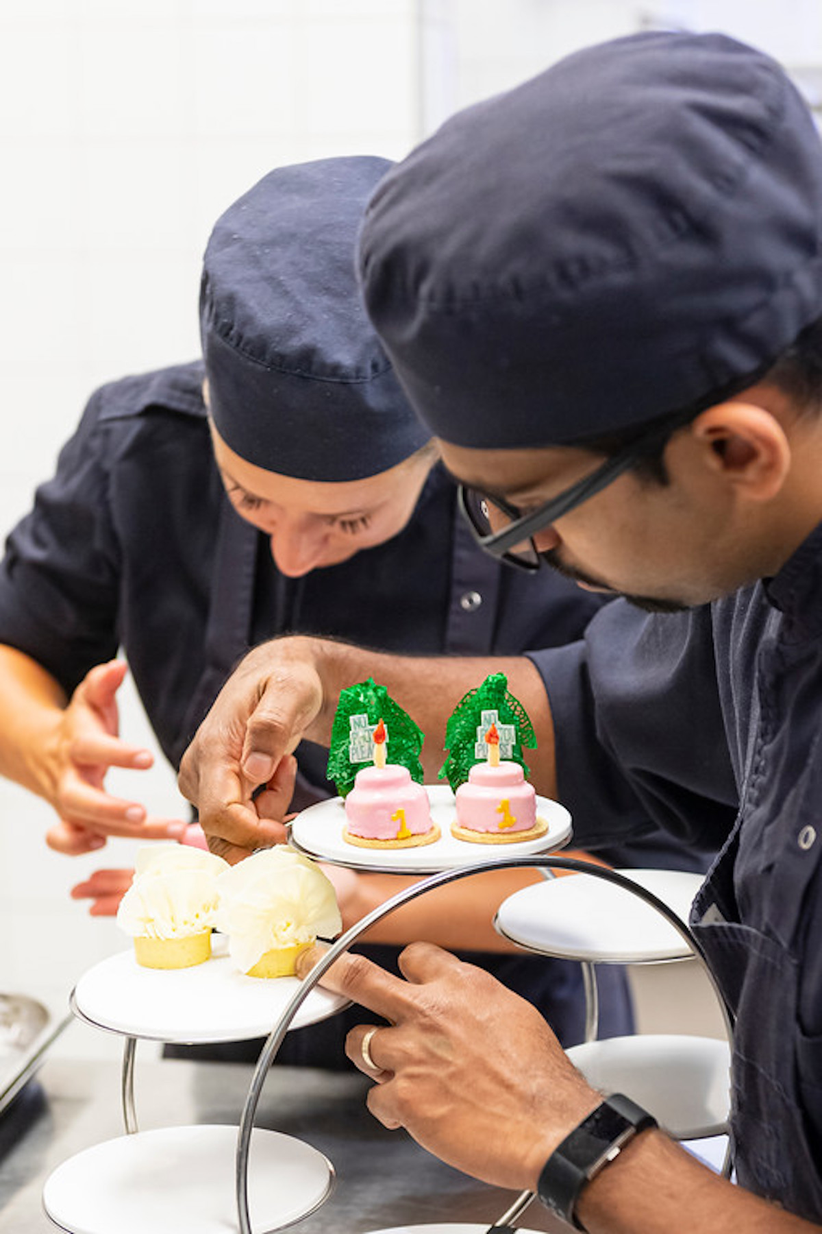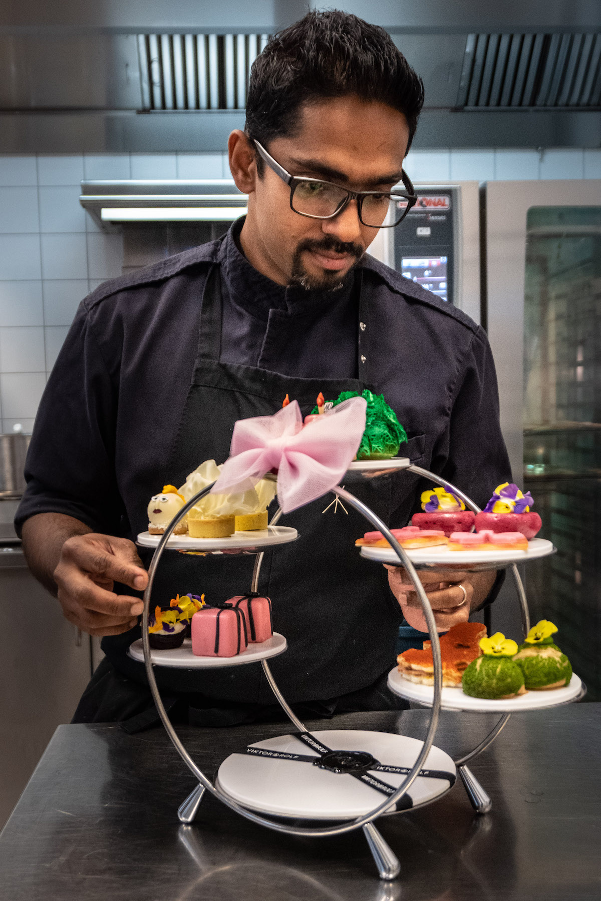 De afgelopen twee maanden werkten ze daarnaast aan alle lekkernijen voor de laatste Summer Afternoon Tea (met als thema: strand). Hun allernieuwste afternoon tea is een samenwerking met modeontwerpers Viktor & Rolf. Vipin en zijn team zijn begonnen met een groot moodboard in de patisseriekeuken. “Iedereen brengt ideeën in”, zegt hij. “Ja, Sidney denkt ook mee. Hij bemoeit zich vooral met de hartige kant”.
