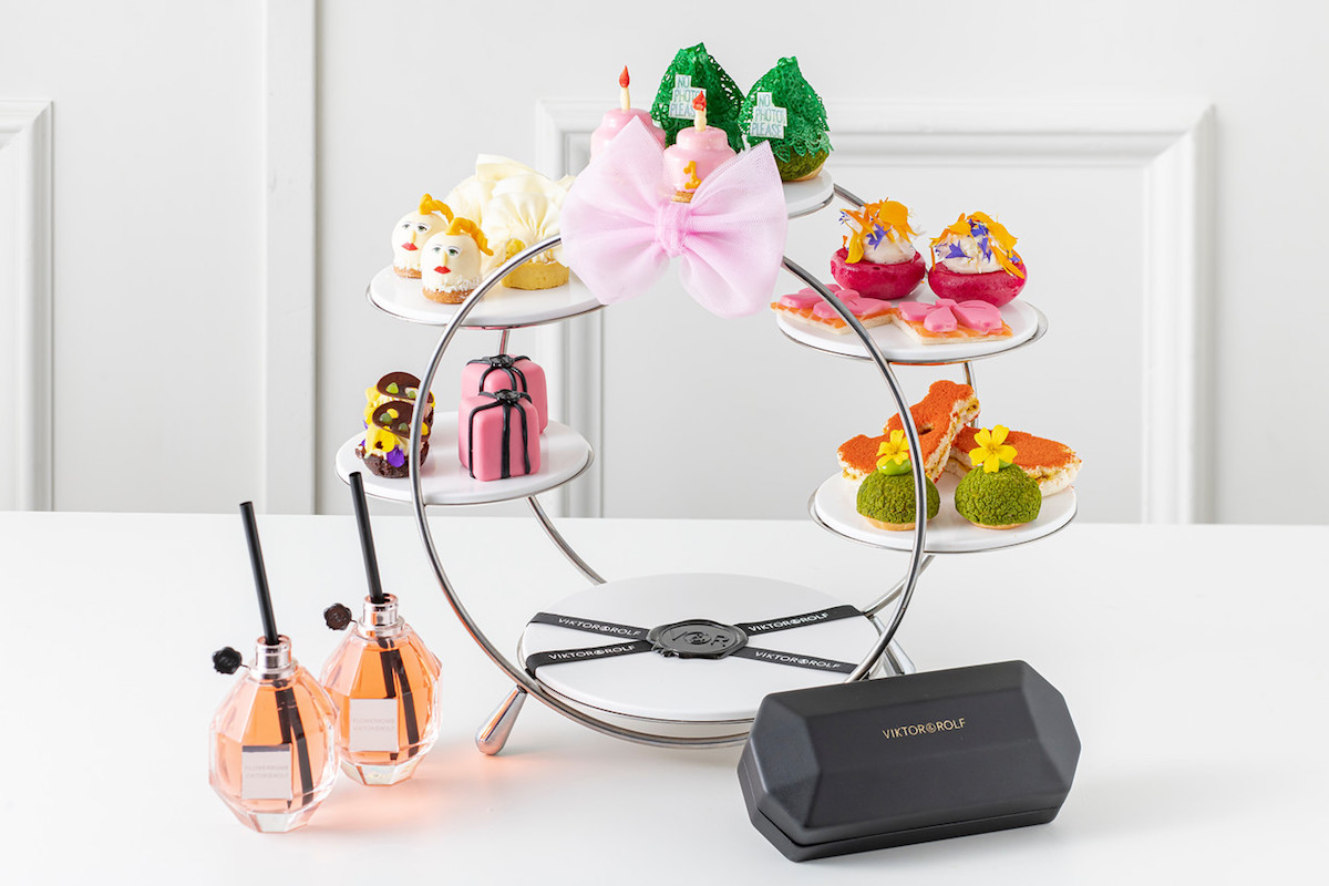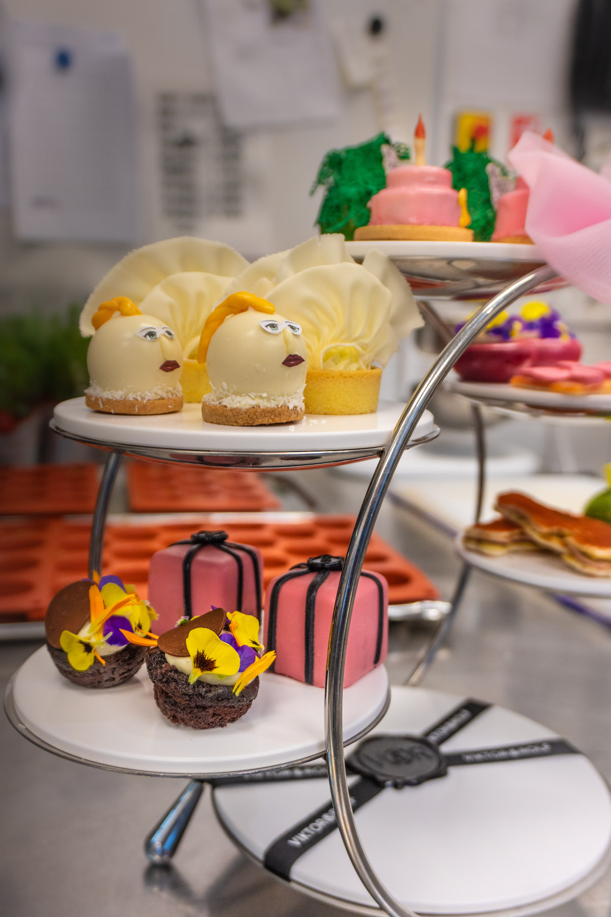 De creaties en de smaken die het team voor deze afternoon tea heeft ontwikkeld, zijn in ieder geval weer fenomenaal. Alle zoete en hartige hapjes zijn geïnspireerd op het ouvre van Viktor & Rolf. De roze bruidstaart van twee lagen, komt bijvoorbeeld terug op alle moodboards van het iconische modeduo. Evenals de roze, cartoonachtige strik, die de signatuur is van de ontwerpers.
