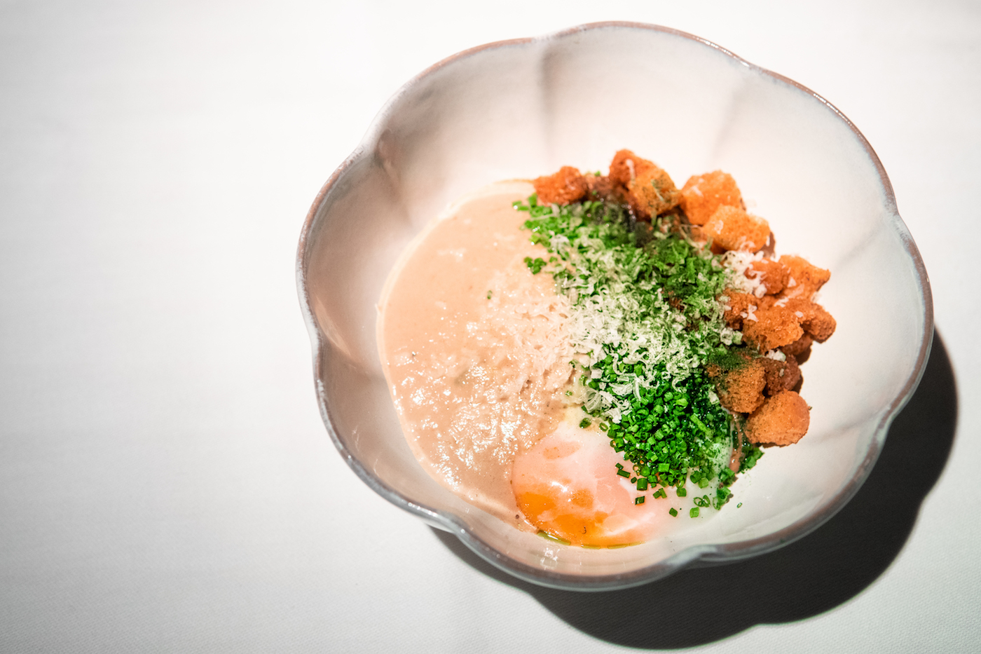 En over rijke vettigheid gesproken: van het volgende gerecht wil je je moeder bellen om haar te vertellen hoeveel je van haar houdt. Een perfect zacht gegaard ei, croutons van brioche, een emulsie van morieljes en Parmezaanse kaas: als dit geen liefde is, weten wij het ook niet meer.