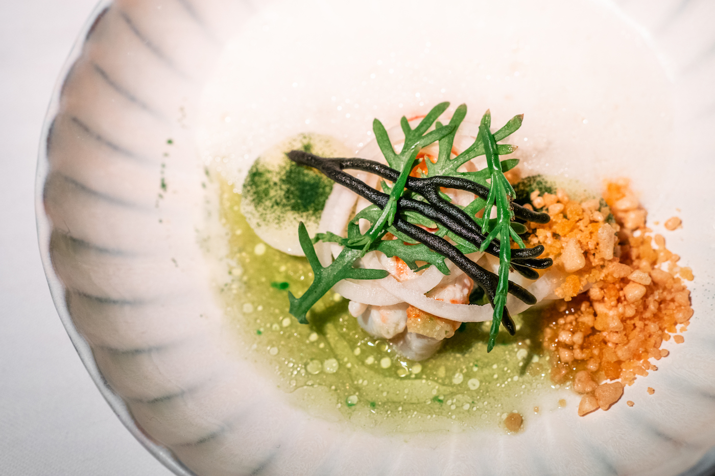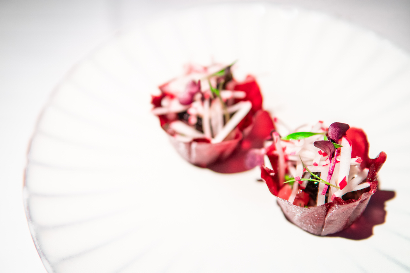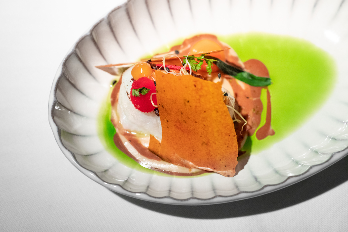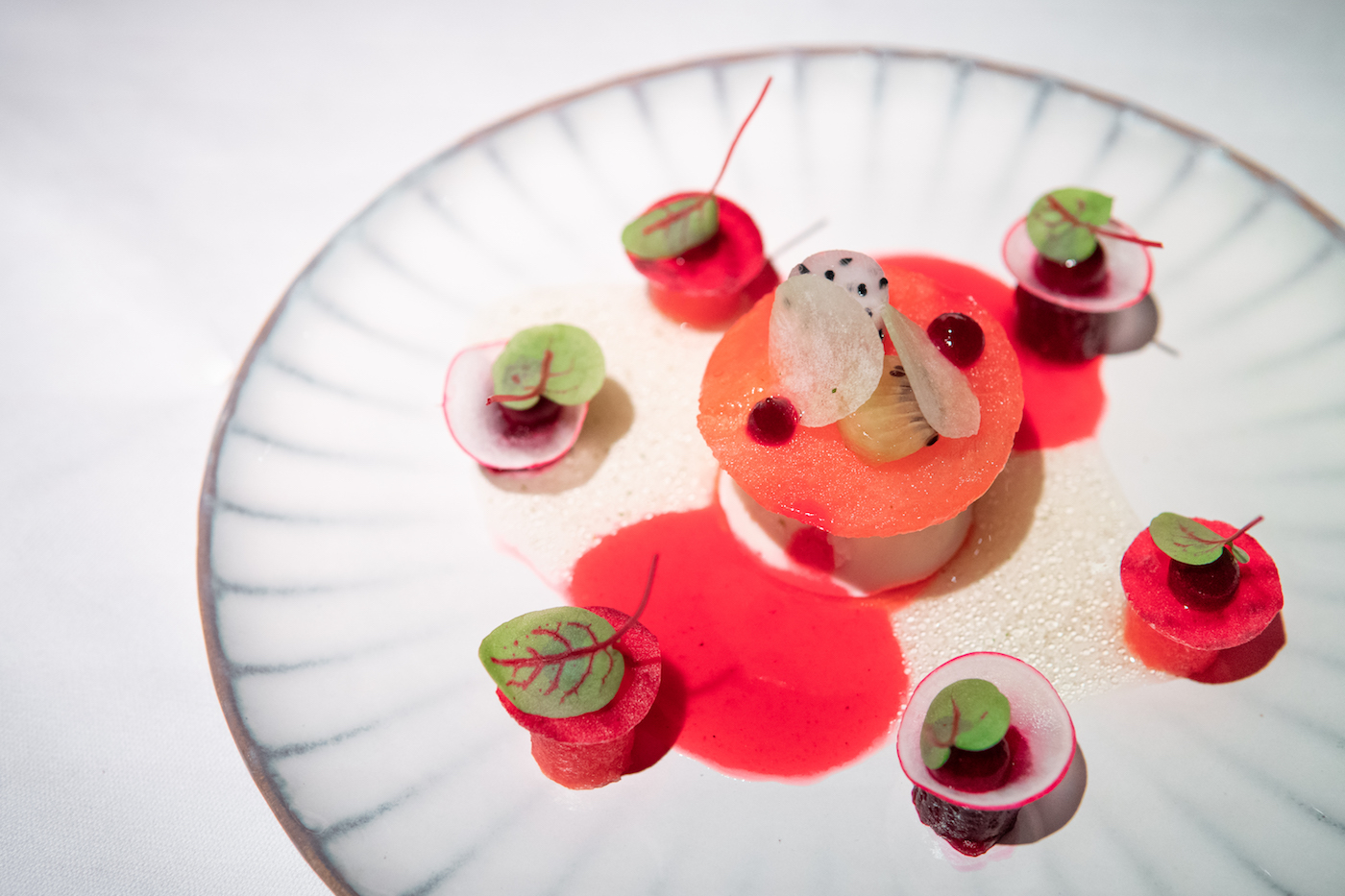Wist je dat watermeloen en biet fantastisch bij elkaar passen? Nee, wij ook niet. En aalbes, en noorzeekrab ook, zo blijkt. We snappen niet hoe Arturo en zijn team zulke heldere, frisse kleuren in dit gerecht hebben weten te krijgen. Het witte gelletje dat naar kaffir lime smaakt, past er te gek bij.