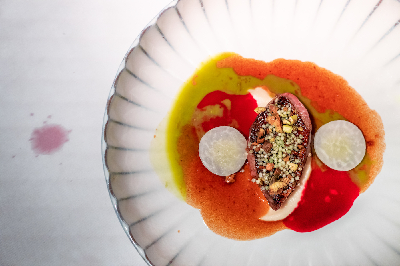Na die ontdekkingsreis, vallen we weer in de vertrouwde armen van een klassieker van Arturo: duif met pistache en kers. Op papier al een perfechte combi, maar in het echt zo mogelijk nog meer. Dat komt onder meer doordat die pistache op verschillende manieren terugkomt: als krokante textuur bovenop de duif, maar ook in een crème en een olie. Sensationeel, durven we te stellen.