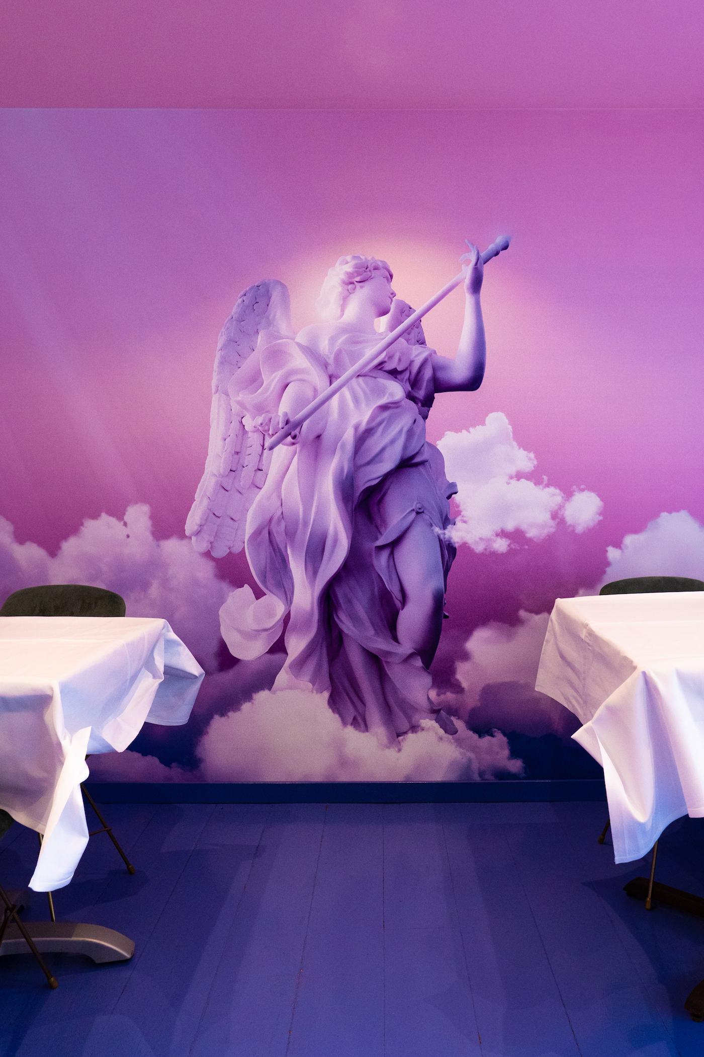 Het is de bedoeling dat je straks bij Bellezza della Vitta na de hartige gangen een verdieping naar boven gaat. Daar wacht een ruimte die is omgetoverd tot een paarsroze ‘hemel’, alwaar je geniet van een dessertbuffet.