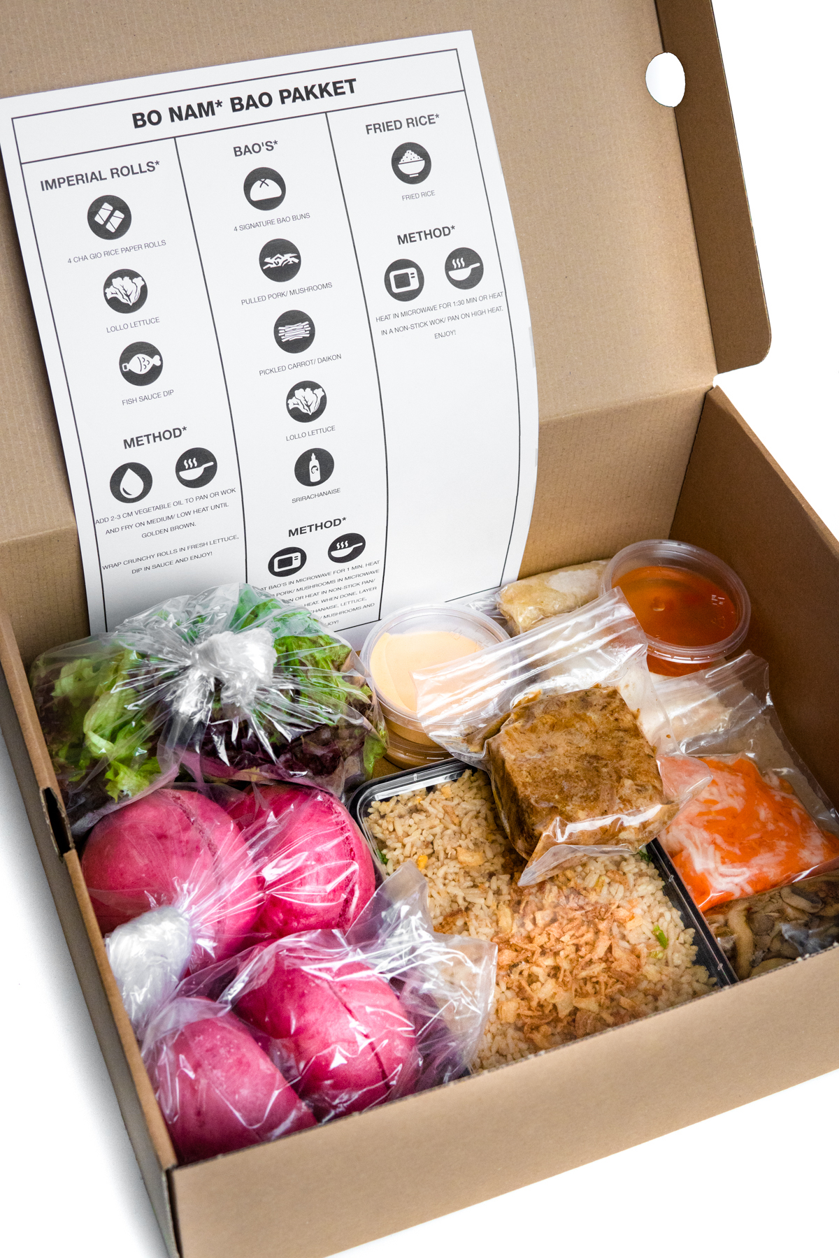 Het bracht Bo Nam ertoe om een BYO baopakket te lanceren: een afhaalmenu in een sneakerdoos, dat je zelf nog even opwarmt en afmaakt. Je kunt het pakket online bestellen en zelf afhalen op een dag en tijdstip naar keuze (tussen 17:00 en 21:00 uur).