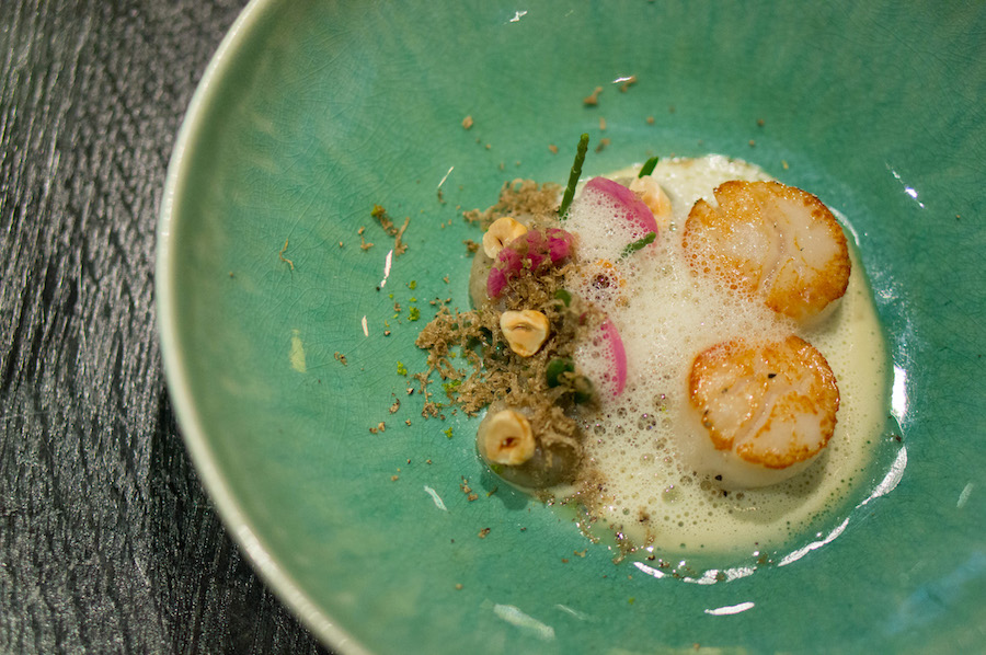 En daar komt ons gerechtje dat is geïnspireerd op de video met rollen plakband. Het zijn coquilles “in the clouds”: ze rusten op schuim van Manzanilla (sherry). Daarbij hazelnoot, crème van topinamboer, Kaffir limoen, zeekraal en witte zomertruffel.