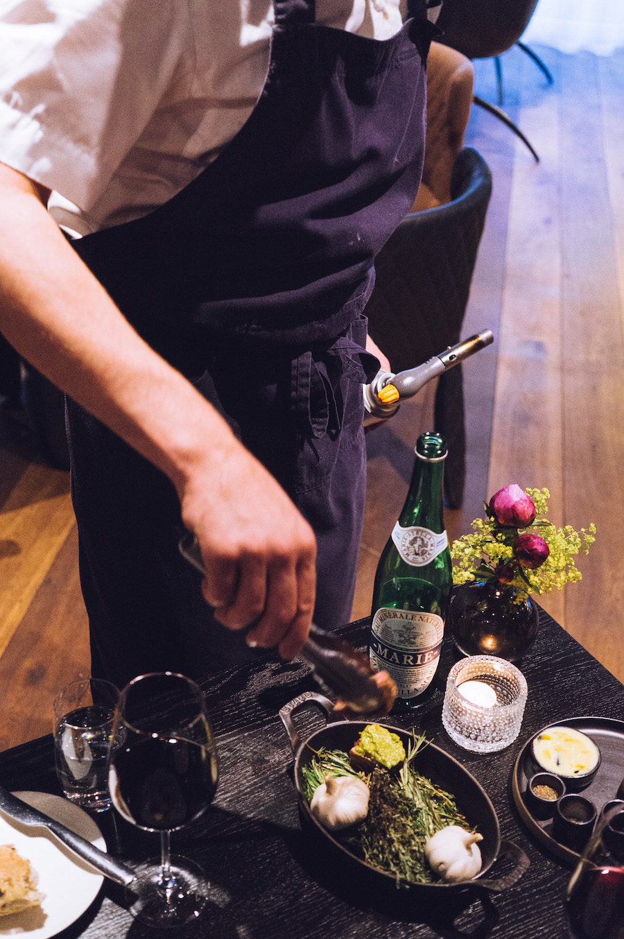 Voor het dessert verlaat de barman zijn riante domein aan de andere kant van het hotel om ons een cocktail te presenteren, passend bij het dessert. Leuk, da’s weer eens wat anders dan dessertwijn. Hij schenkt Willems Wermoed: een Amsterdamse vermouth, gemaakt met kruiden uit de Hortus Botanicus in Amsterdam. Denk aan kersenbloesem, wilde tijm en sinaasappel. Yum.