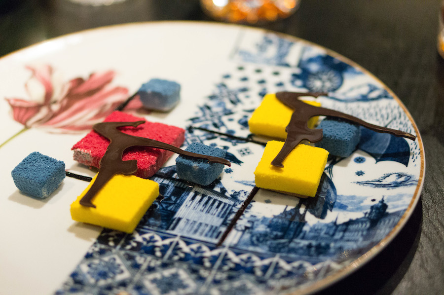 Het dessert is het toppunt van speelsheid. Letterlijk: we mogen spelen met ons eten. We krijgen alvast wat handdoekjes en een bordje vol vierkante gebakjes, met rode chili, blauwe bes en groene thee met citroen. Daarbovenop chocolade-figuren in de vorm van de dansers die we eerder in een art video zagen.