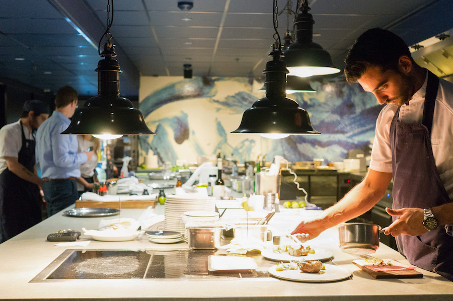 Restaurant Bluespoon sluit daarop aan. Nu zijn hotelrestaurants doorgaans niet heel spannend (clubsandwich anyone?) of juist overdreven formeel. Da’s andere koek bij Bluespoon. Hier willen ze er een beleving van maken. En daar zijn wij helemaal voor in. Dat het restaurant een open keuken heeft, is trouwens een understatement: je kijkt zó op de werkbanken van de chefs, die rond grote kookeilanden bewegen.