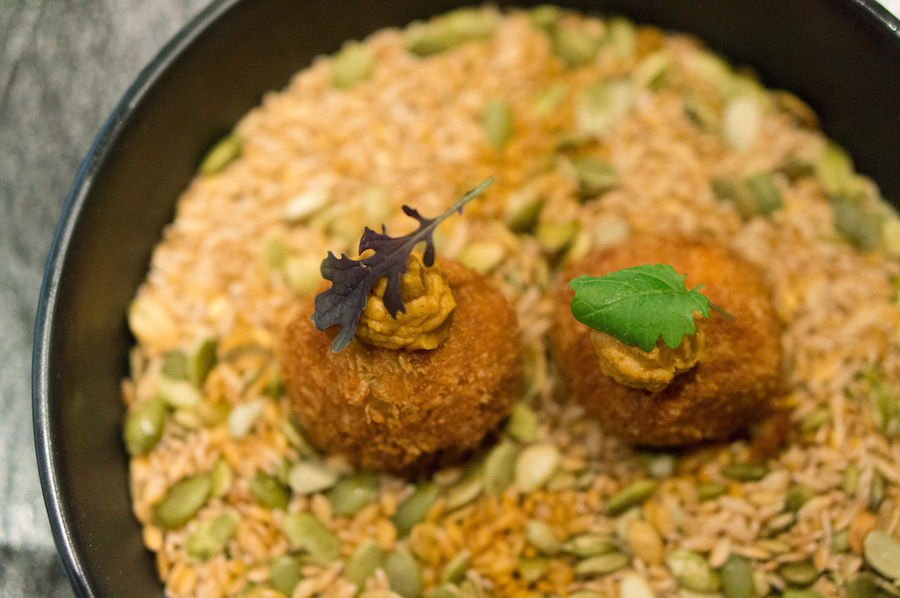 We beginnen ons video-artmenu met een bitterbal met topinamboer en een vleugje hummus. “Bluespoon in één bite”, aldus de hostess. Deze mogen ze van ons in grote zakken gaan verkopen in de supermarkt. Al krijgen we die natuurlijk zelf nooit zo lekker krokant gebakken. Maar daar filosoferen we een andere keer wel over door.