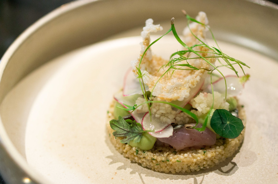 Het eerste gerechtje wacht namelijk: quinoa met appel (verbazingwekkend fijn brunoise gesneden!), crème fraîche en makreel. Die is duurzaam gevangen. Bovendien doneert Bluespoon voor elk gerecht een euro aan de Good Food Foundation. Kijk, daar worden we blij van. En de rauwe makreel (sashimi-style) smaakt er nog net iets lekkerder door.