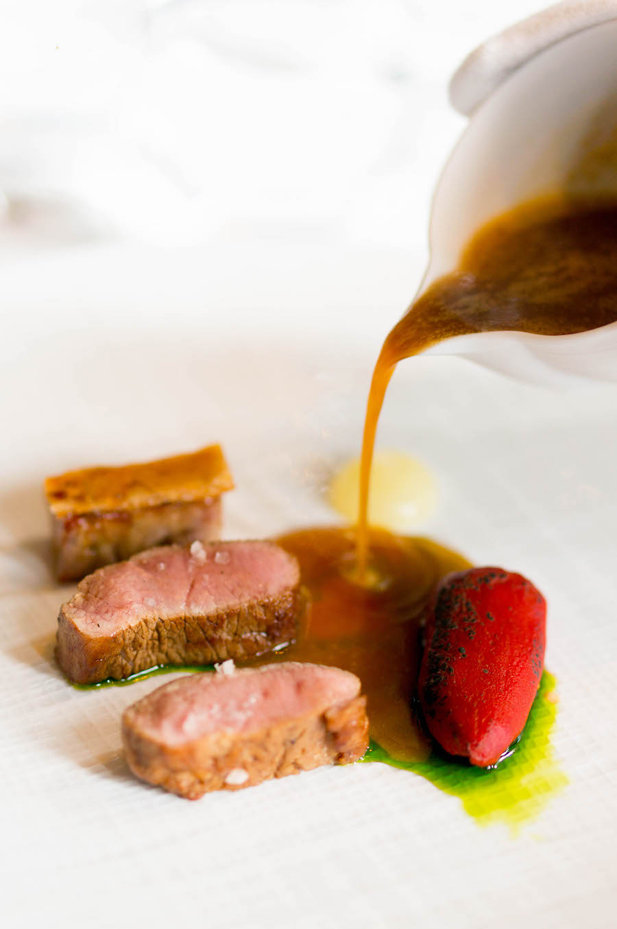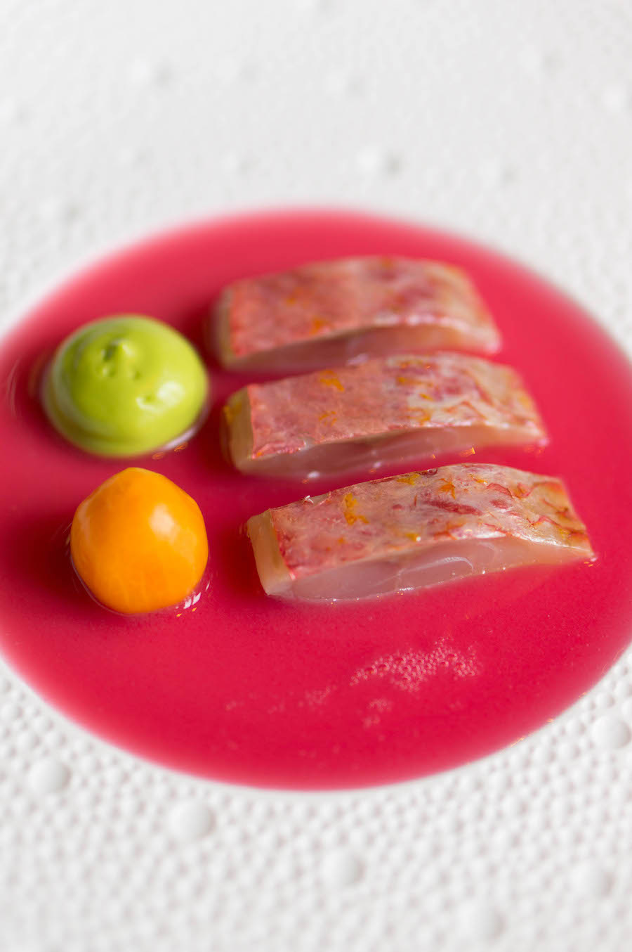 Daarna volgen nog veel meer mooie, frisse, lichte gerechtjes die hoog op smaak zijn en verrassen. Rode mul die van het bord knalt, niet alleen vanwege de felle kleuren, maar ook qua fris, fruitig en tangy.