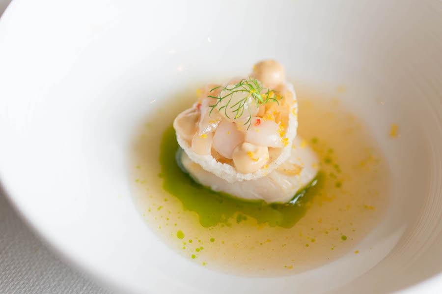 En een Noorse coquille die we elke dag wel kunnen eten, met tom yum, groene papaya, sesam-crème en zest van yuzu die de chef hoogstpersoonlijk boven ons bord komt raspen. Mooie hitte, mooie zuren, mooie texturen.
