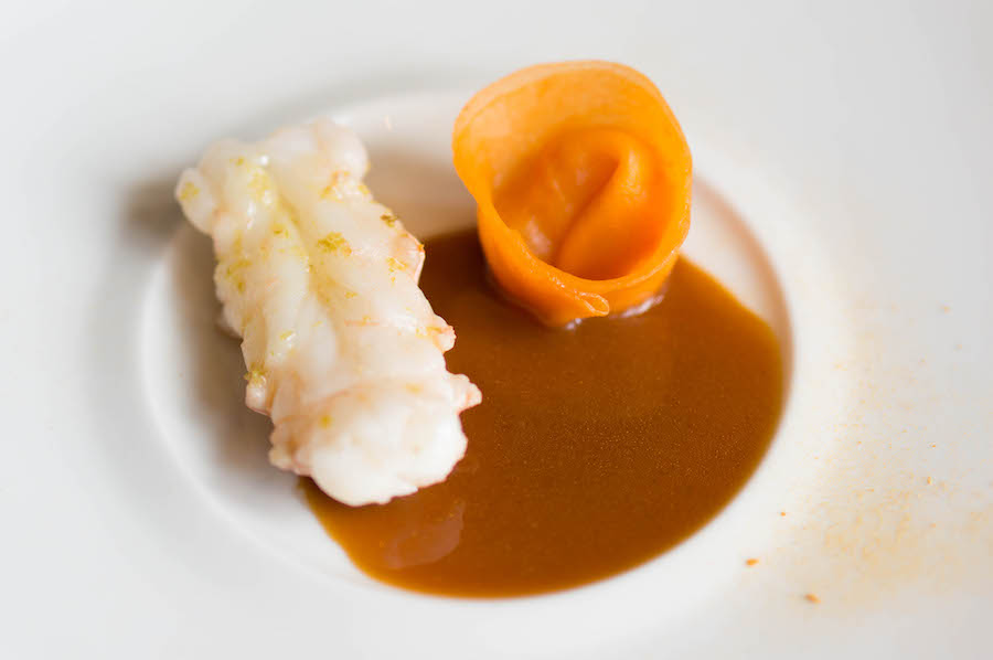 Maar ook een langoustine die zowel zacht en boterig als licht krokant en stevig is. En dan die saus met Noord-Indiase specerijen erbij, wauw.