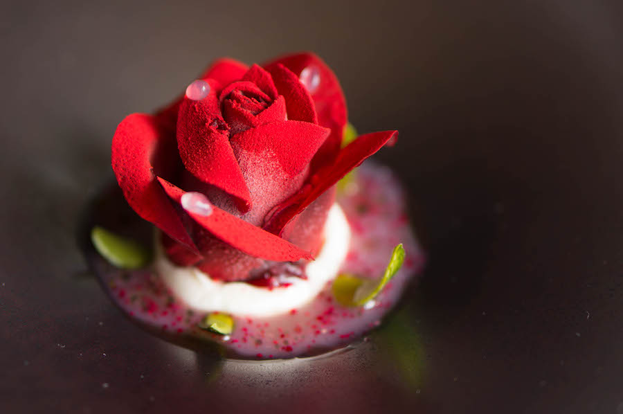 Zelfs als je geen toetjesmens of liefhebber van zoet bent, kun je niet anders dan je gewonnen geven als je het dessert van de chef voor je neus krijgt. Het is een roos van rode biet met lychee, olijfolie en geitenkaas.