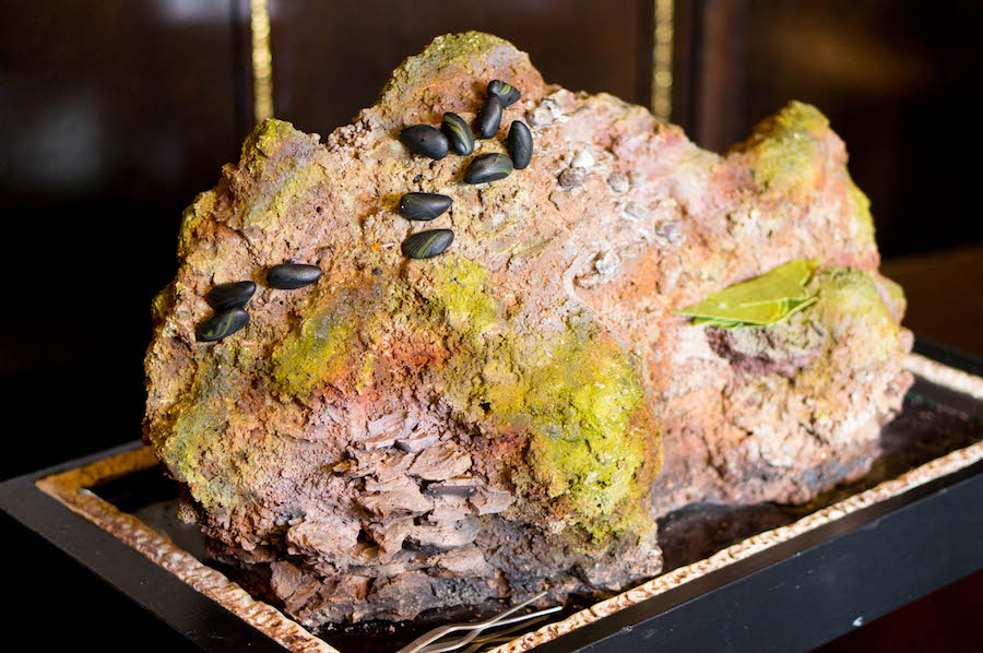 Dan kun je meteen even een blik werpen op het stuk rotsblok, gemaakt van 29 kilo chocolade, waar al deze zoete fruits de mer op zijn geplaatst.