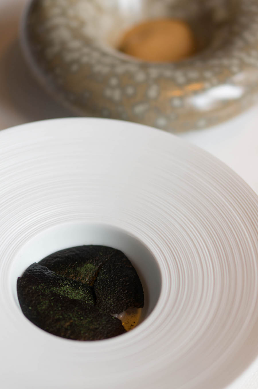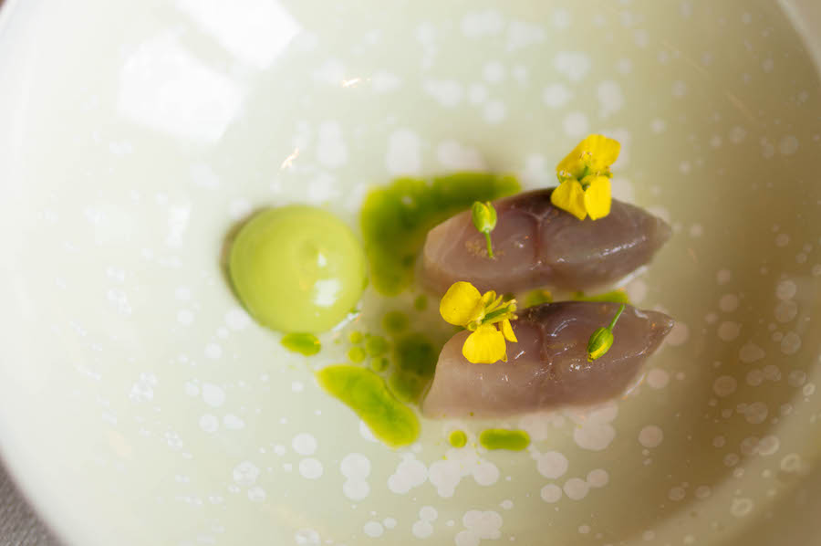 Dat begint al meteen bij de eerste amuse: gerookte makreel met dashi-azijn, bergamot en crème van basilicum. Dit gerechtje was een signature dish van het restaurant en is nu vertaald naar een amuse.