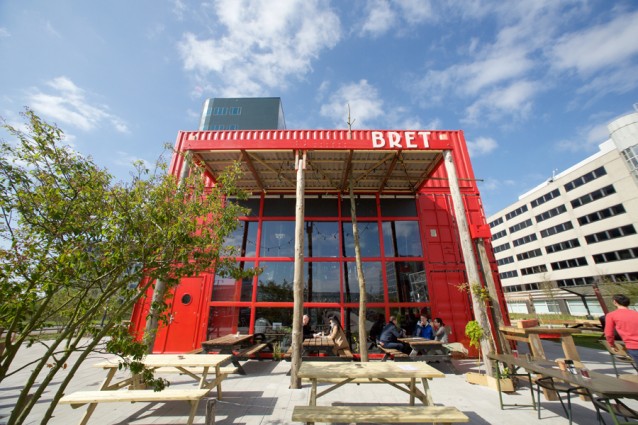 Wanneer je aan de voorkant van het station staat zie je BRET gelijk: een knalrood, vierkant pand gemaakt van containers. Bijzonder is dat ze echt een verschil willen maken in het treurige landschap rondom Sloterdijk. Dit doet ze onder andere door de aanleg van een enorme stadstuin, waar onder andere hop groeit waar ze in de toekomst bier mee gaan brouwen en workshops zullen organiseren.