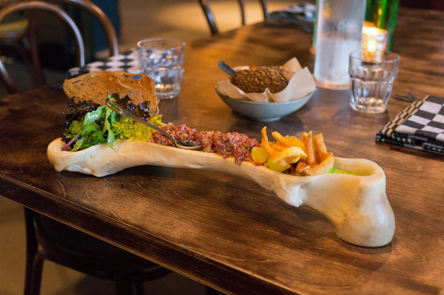 Ook de steak tartare (Kouwe Aap genaamd) is niet wat je verwacht: om te beginnen wordt het gerechtje opgediend in een enorm, uitgehold bot. Als je dacht dat het niet gekker kon, weet dan dat Sidney die zelf maakt, samen met zijn vader en schoonvader. “Na een maand is zo’n bot klaar”, aldus de chef. Ook bijzonder zijn de stukjes gifgroene jelly bij de tartaar, gemaakt met Amsterdamse uienvocht.