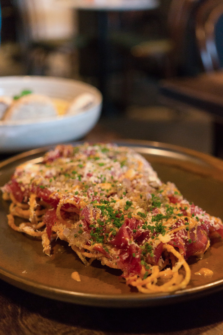 Ook top is de Dijenkletser: Café Cliché’s interpretatie van een carpaccio. Sidney: “Dit is mijn idee van een lekkere carpaccio. Dus niet het normale hoopje vlees waar je een vork overheen haalt en het is weg.” Dit is carpaccio zonder clichés: gerookte runderlende opgediend op slierten krokante aardappel, met onder andere rauwe champignon, flink veel geraspte Bunkerkaas, kappertjes en sjalot en iets wat de chef Kanonnenzurebommensaus noemt.