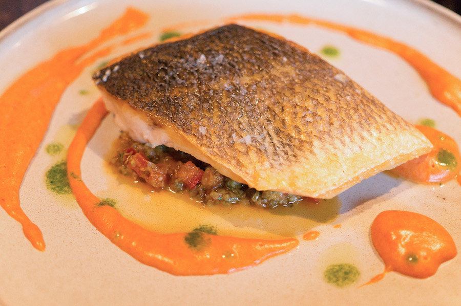 Zoals de Gekke Gerrit: een Thaise ceviche van zeebaars in groene curry, met kokos, Thaise basilicum en zoete aardappel. De kokosroom moet je vooral lekker door het gerecht mengen, aldus Sidney. De chef heeft het gerecht pas gisteren gecreëerd, maar het smaakt nu al als een klassieker: “Ik heb ‘m drie keer gemaakt en toen vond ik ‘m goed”.