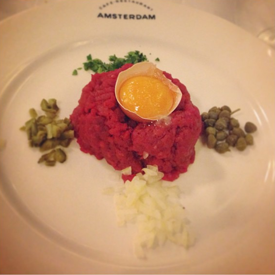 Culy’s Monique bestelt altijd, maar dan ook altijd, vooraf de garnalencroquettes van Holtkamp (mét gefrituurde peterselie & citroen) en vervolgens de heerlijke steak tartare, met uitjes, kappertjes, augurk en groene kruiden. En uiteraard: een eidooiertje.