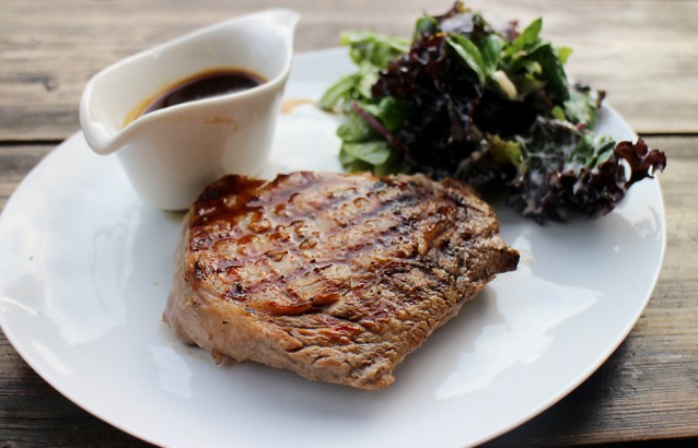 Ook bestellen we de supersappige kalfsribeye van MRIJ-rund met daarbij een subtiele jus van zomertruffel en simpele, maar lekker frisse salade (€18,50).