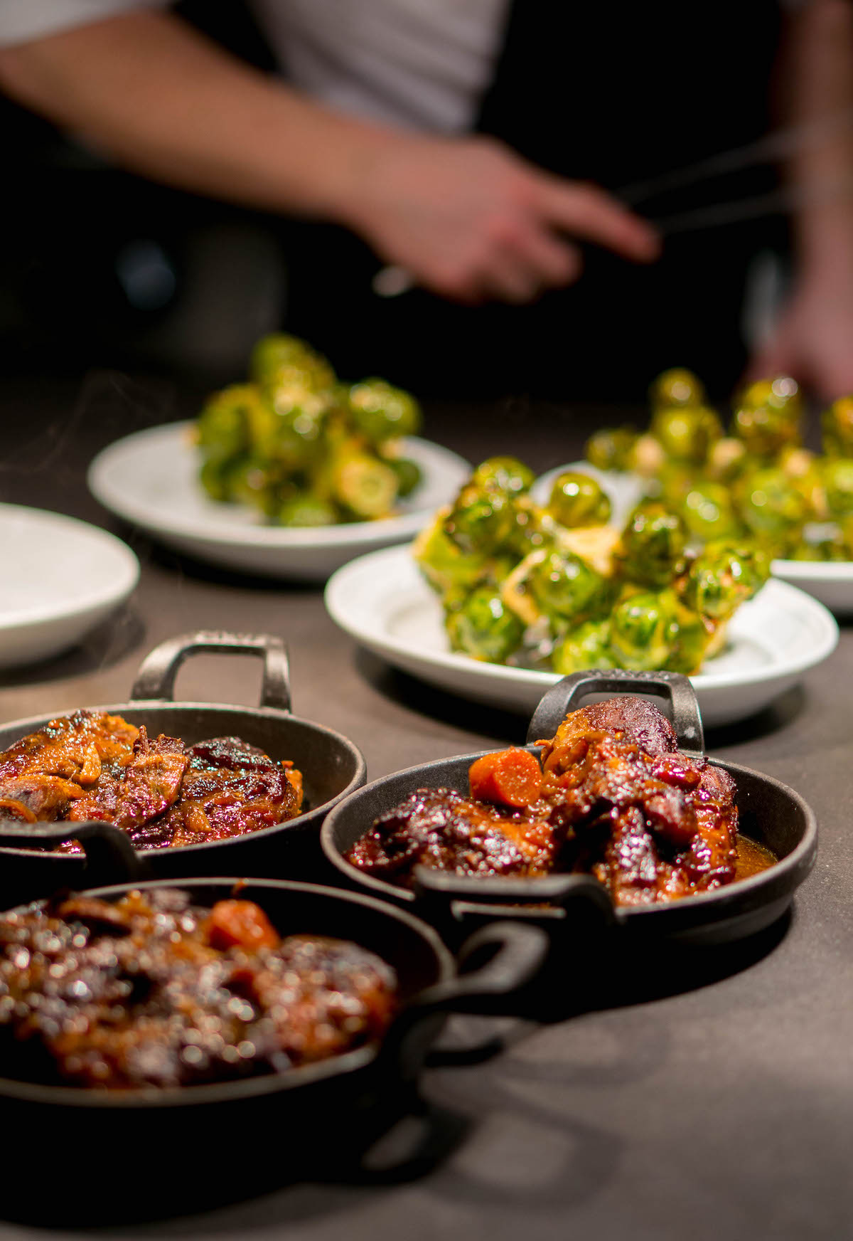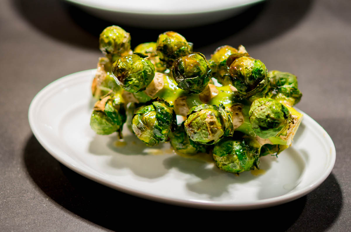 Denk aan een grote stronk met spruiten, die je zélf los mag snijden aan tafel. Restaurantmanager Timo van der Stad vertelt: “Die spruiten trekken ze uit de volle grond. Wij hoeven zo’n stronk alleen maar in vieren te hakken en te blancheren. Daarna lakken we ze en garen we ze in de oven.” Het is een feest om zo’n mooi product op je bord te zien.