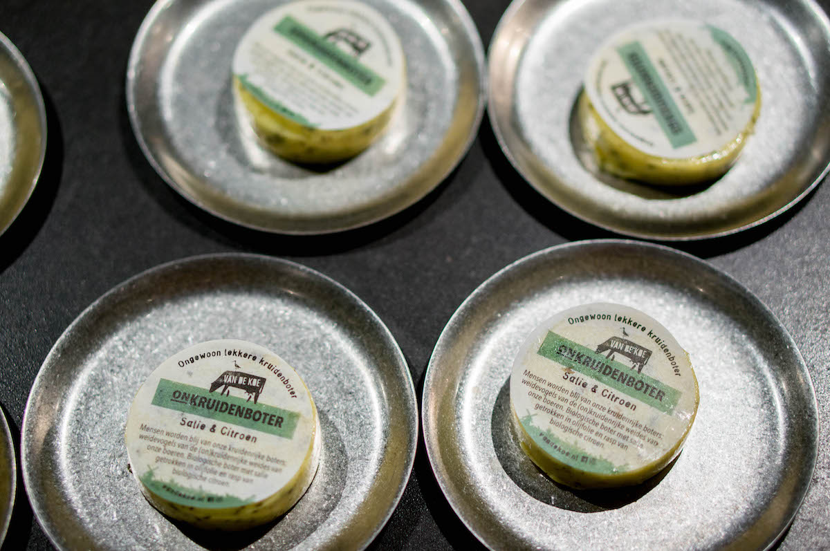 En waar je – naast de wijn – ook even een gaatje voor over moet houden, zijn het brood en de boter van Carstens. Brood wordt gebakken door bakker Maarten en heeft een lekkere dikke korst vol geroosterde zaden. Helemaal een feest met de Onkruidenboter erop: biologische boerenboter met wildgeplukte kruiden uit het Amstelland. In dit geval met salie – die daar tussen de kruiden door woekert, op smaak gebracht met citroen. Daar wordt een mens blij van.