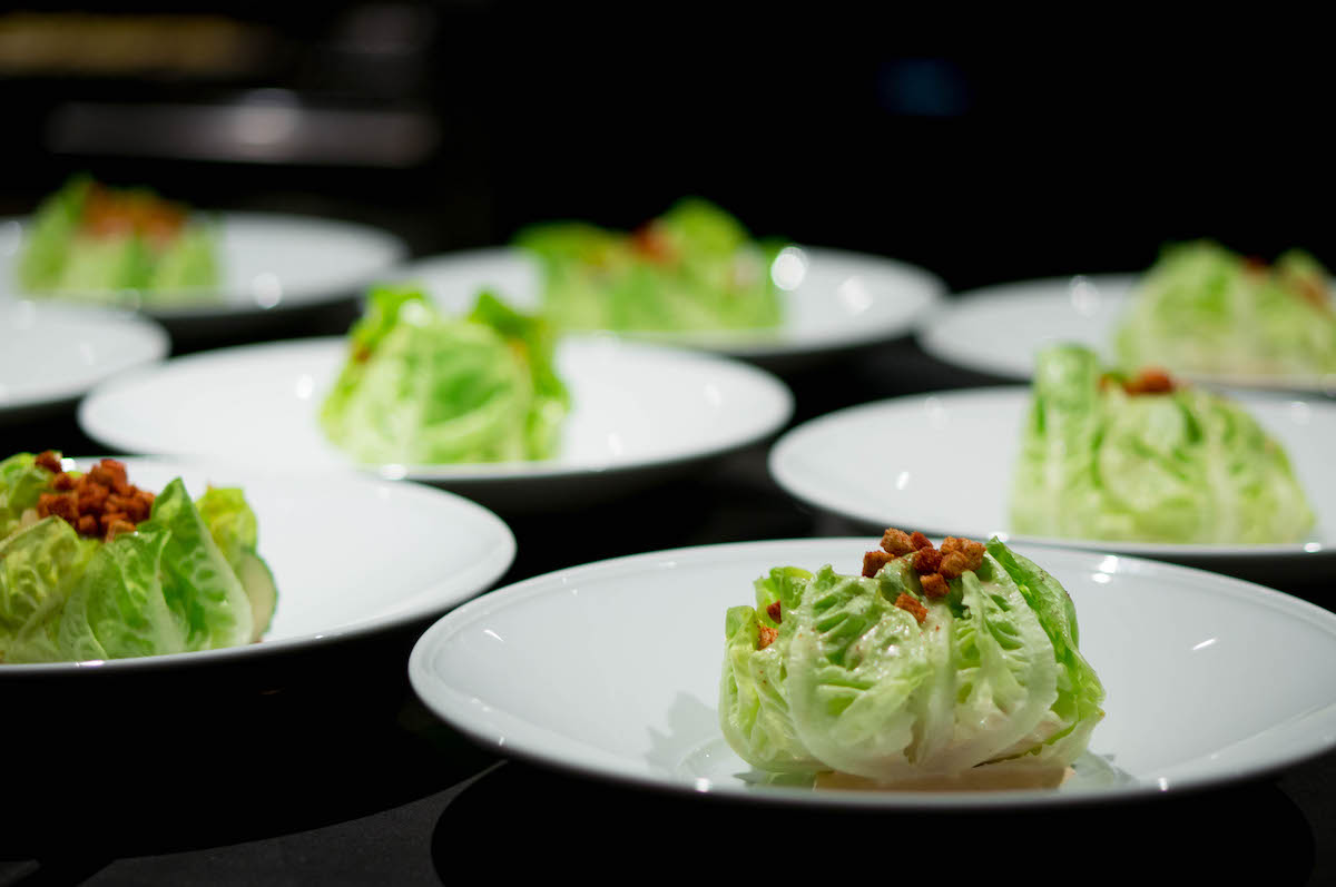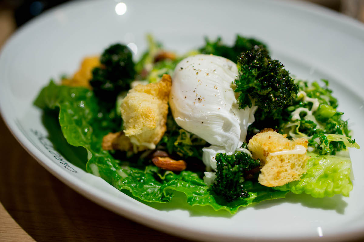 De salade bestaat uit een groot, knapperig slablad, met daarop fijngesneden boerenkool met een klassieke Caesar-dressing, ansjovis, croutons van brioche, gezouten amandelen, gefrituurde boerenkool en een gepocheerd ei. Het bevat alle umami die je verlangt van een Caesar salad, maar dan zonder een spoortje kip of spek. Knap gedaan dus.